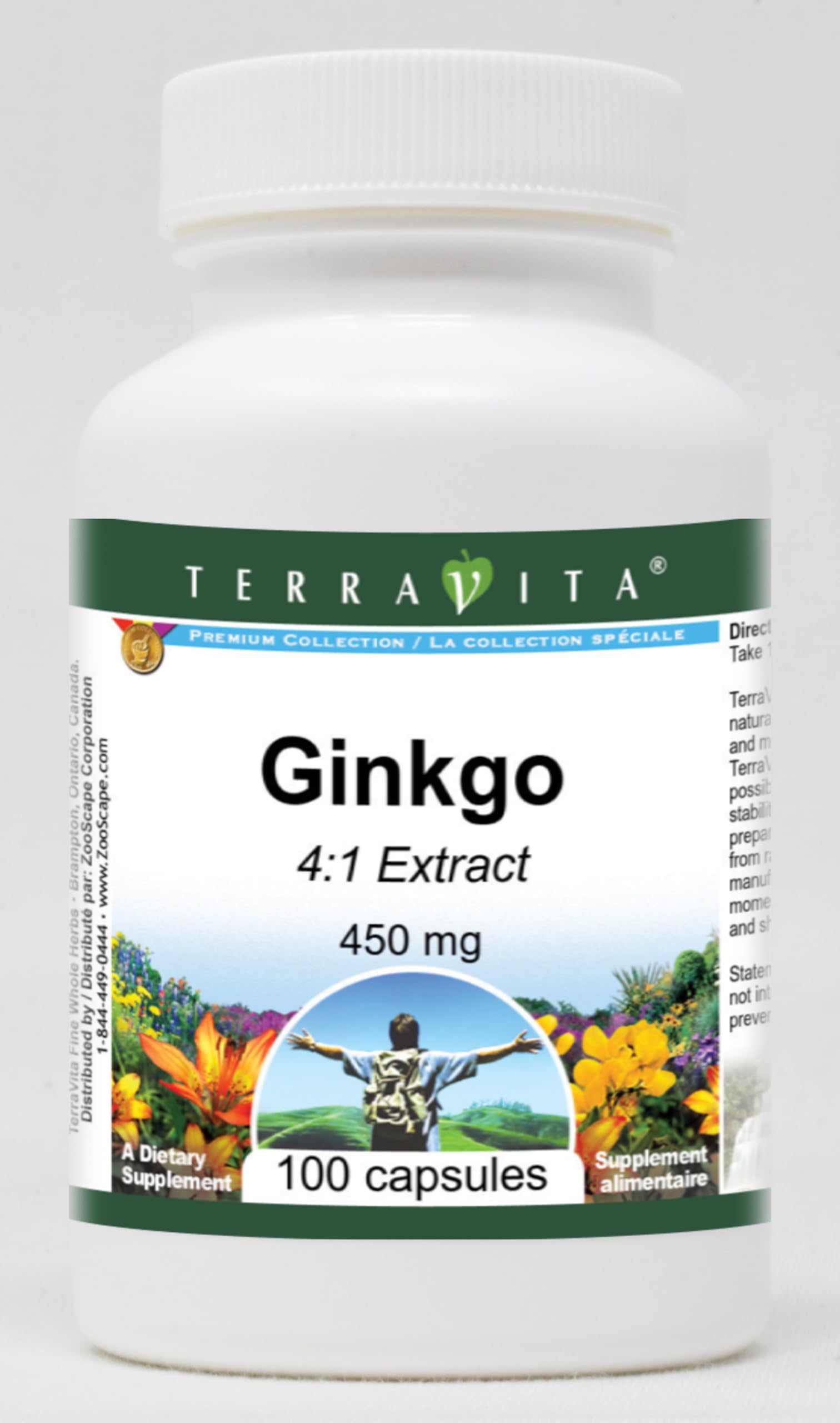 Ginkgo 4:1 - 450 mg (100 capsules, ZIN: 520212) Packaged in the United States in a GMP certified facility (Good Manufacturing Practice). No fillers. Manufacturer: TerraVita Size: 100 capsules Easy-to-swallow Capsules in a sealed bottle. Ingredients: Gelatin, Water, Ginkgo 4:1 Extract - 450 mg