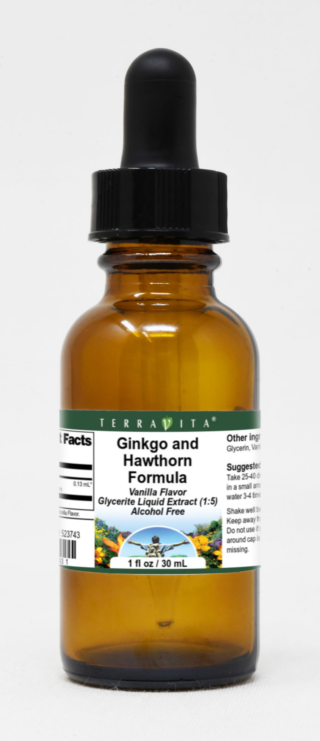 Ginkgo and Hawthorn Formula Glycerite Liquid Extract (1:5) - Vanilla Flavored (1 oz, ZIN: 523743) Packaged in the United States in a GMP certified facility (Good Manufacturing Practice). No fillers. Manufacturer: TerraVita Size: 1 oz Convenient Liquid format. Ingredients: Artificial Vanilla Flavor, Glycerin (Vegetable Source), Ginkgo Biloba Leaf, Hawthorn