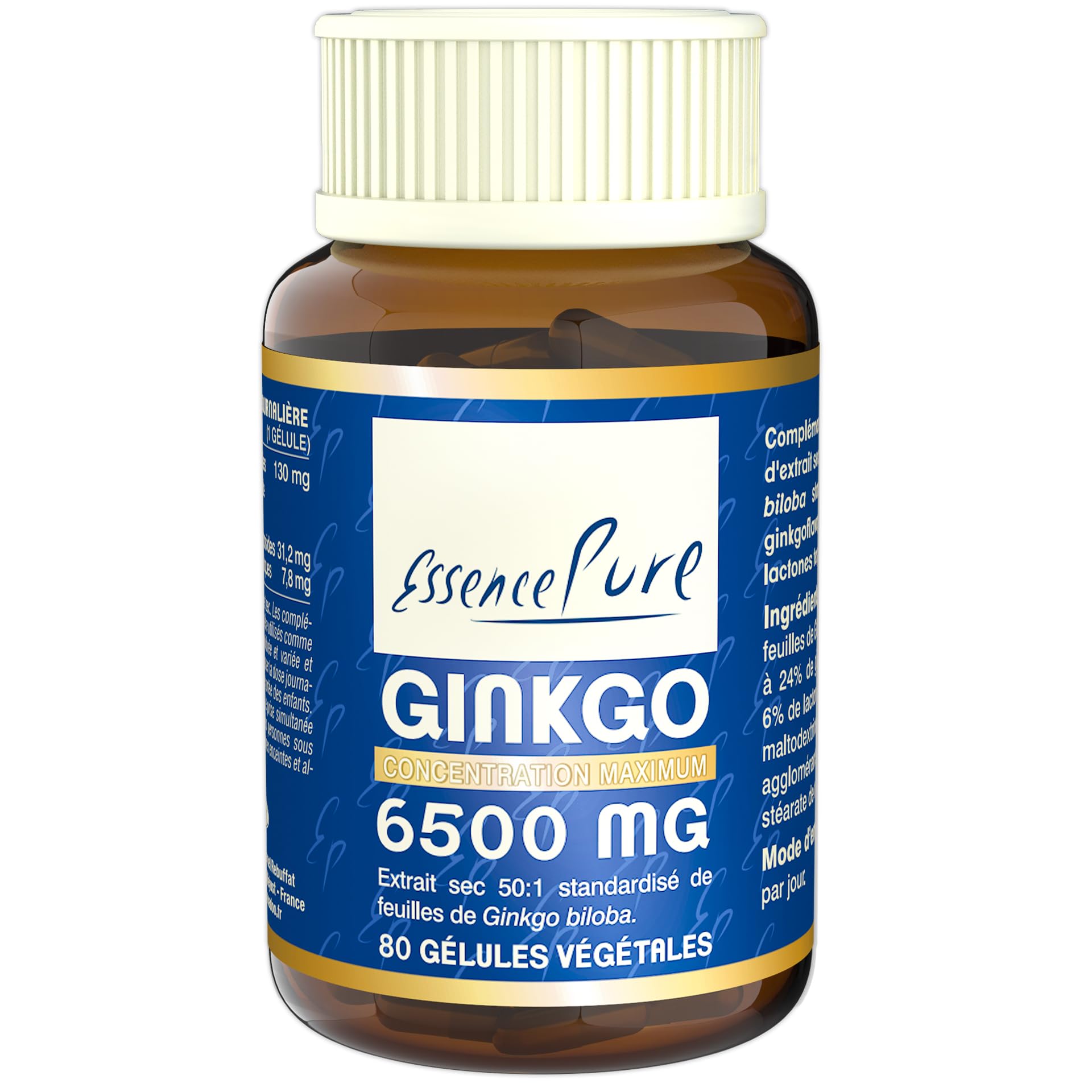 GINKGO 6500 MG Pure Essence dietary supplement is a high-quality product that provides numerous benefits. Each vegetarian capsule contains a concentrated 50:1 dry extract of Ginkgo biloba leaves, standardized to 24 ginkgoflavoglycosides and 6 terpene lactones. These active compounds support memory, cognitive function, and peripheral circulation. With 31.2 mg of ginkgoflavoglycosides and 7.8 mg of terpene lactones per capsule, this pure product, free from allergens, heavy metals, aflatoxins, and pesticides, is ideal for daily use. It is recommended to take 1 capsule daily to benefit from its benefits. Manufactured to strict standards, this dietary supplement is a wise choice for those wishing to improve their cognitive health and blood circulation. INGREDIENTS 50:1 dry extract of Ginkgo biloba leaves standardized to 24 ginkgoflavoglycosides and 6 terpene lactones 130 mg, maltodextrin, vegetable capsule and anti-caking agents (silicon dioxide and magnesium stearate).INNOVATION AND TRADITION FOR YOUR WELL-BEING: With over 40 years of experience, Api-Nature combines ancestral wisdom with contemporary progress. We select the purest ingredients, processed in our GMP and HACCP certified facilities. Celebrate life with the best of nature and innovation. SUPERIOR QUALITY: This food supplement is pure, without allergens, heavy metals, aflatoxins, or pesticides, thus guaranteeing superior quality. HIGH DOSAGE: Each capsule provides 31.2 mg of ginkgoflavoglycosides and 7.8 mg of terpene lactones, making it a highly concentrated product. SUPPORT FOR MEMORY AND COGNITIVE FUNCTIONS: Thanks to its ginkgoflavoglycosides and terpene lactones, this dietary supplement helps support memory, cognitive functions and peripheral circulation. CONCENTRATED GINKGO BILOBA EXTRACT: These capsules contain a concentrated 50:1 dry extract of Ginkgo biloba leaves, standardized to 24 ginkgoflavoglycosides and 6 terpene lactones. Le complément alimentaire GINKGO 6500 MG Essence Pure est un produit de haute qualité qui apporte de nombreux bienfaits. Chaque gélule végétale contient un extrait sec concentré 50:1 de feuilles de Ginkgo biloba, standardisé à 24 en ginkgoflavoglycosides et 6 en lactones terpéniques. Ces composés actifs soutiennent la mémoire, les fonctions cognitives et la circulation périphérique. Avec 31,2 mg de ginkgoflavoglycosides et 7,8 mg de lactones terpéniques par gélule, ce produit pur et sans allergènes, métaux lourds, aflatoxines ou pesticides est idéal pour une prise quotidienne. Il est recommandé de prendre 1 gélule par jour pour profiter de ses bienfaits. Fabriqué selon des normes strictes, ce complément alimentaire est un choix judicieux pour ceux qui souhaitent améliorer leur santé cognitive et leur circulation sanguine. INGRÉDIENTS Extrait sec 50:1 de feuilles de Ginkgo biloba standardisé à 24 de ginkgoflavoglycosides et 6 de lactones terpéniques 130 mg, maltodextrine, gélule végétale et anti-agglomérants (dioxyde de silicium et stéarate de magnésium).INNOVATION ET TRADITION POUR VOTRE BIEN-ÊTRE : Avec plus de 40 ans d'expérience, Api-Nature allie sagesse ancestrale et progrès contemporains. Nous sélectionnons les ingrédients les plus purs, transformés dans nos installations certifiées GMP et HACCP. Célébrez la vie avec le meilleur de la nature et de l'innovation. QUALITÉ SUPÉRIEURE : Ce complément alimentaire est pur, sans allergènes, métaux lourds, aflatoxines ou pesticides, garantissant ainsi une qualité supérieure. DOSAGE ÉLEVÉ : Chaque gélule apporte 31,2 mg de ginkgoflavoglycosides et 7,8 mg de lactones terpéniques, ce qui en fait un produit hautement concentré. SOUTIEN À LA MÉMOIRE ET AUX FONCTIONS COGNITIVES : Grâce à ses ginkgoflavoglycosides et lactones terpéniques, ce complément alimentaire aide à soutenir la mémoire, les fonctions cognitives et la circulation périphérique.. EXTRAIT CONCENTRÉ DE GINKGO BILOBA : Ces gélules contiennent un extrait sec concentré 50:1 de feuilles de Ginkgo biloba, standardisé à 24 en ginkgoflavoglycosides et 6 en lactones terpéniques.