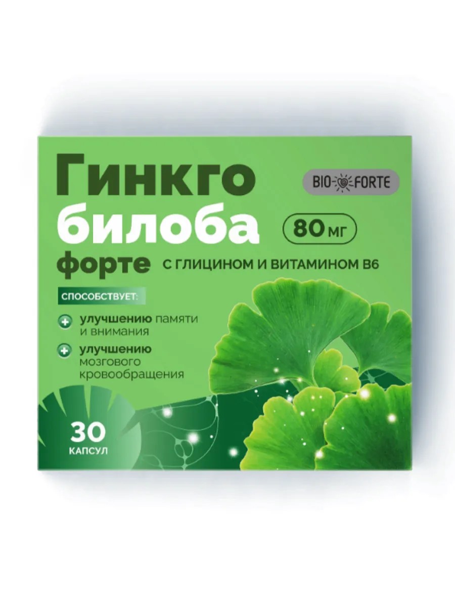 Гинкго Билоба ФОРТЕ +Глицин+Витамин В6 BioForte капс - комплекс для поддержки когнитивных функций. Улучшает работу мозга, снижает стресс. Способствует улучшению памяти и внимания, повышению умственной работоспособности, улучшению мозгового кровообращения.