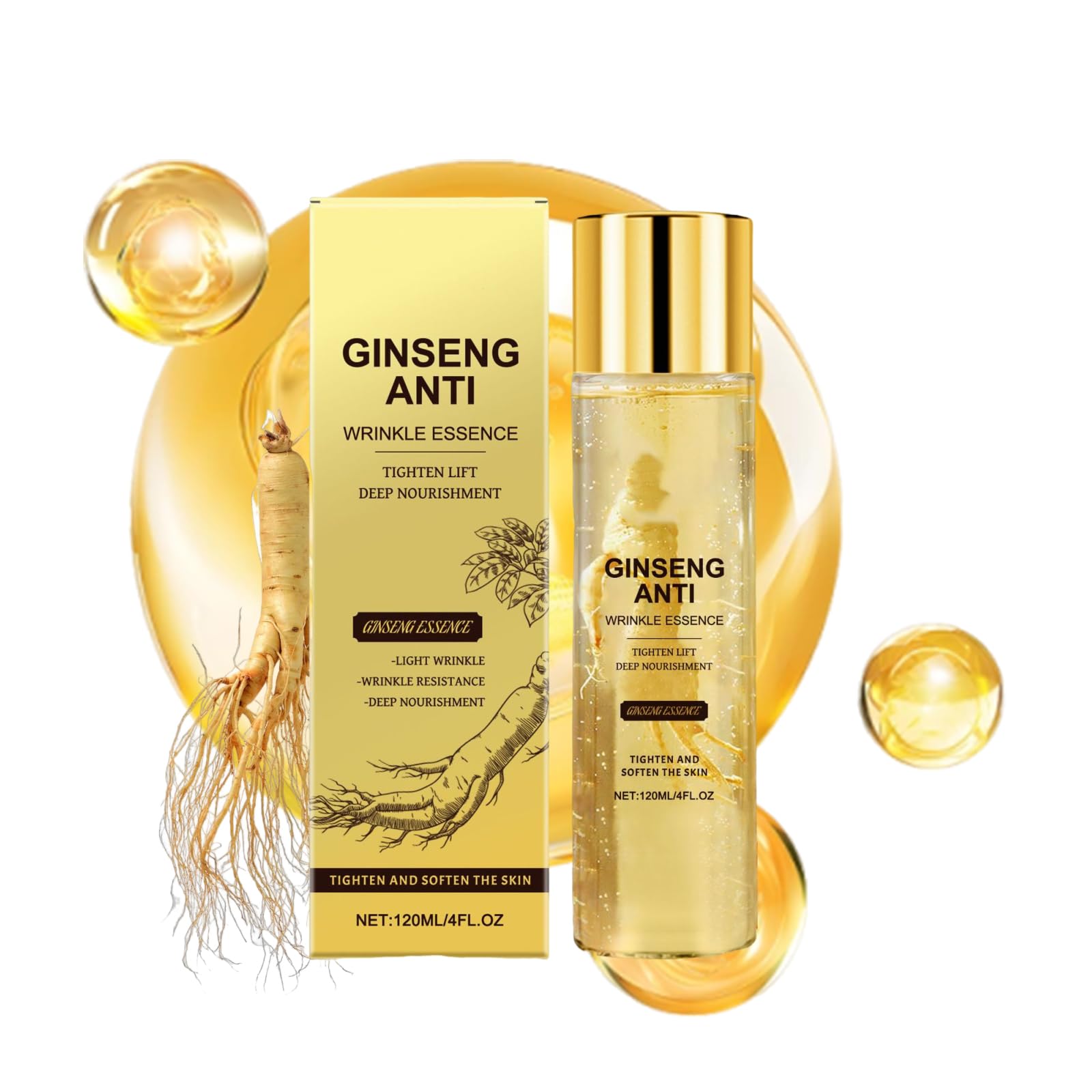 Name: Ginseng Essence Anti Wrinkle Essence, 4 Fl Oz Ginseng Essence Water, Anti-Aging Firming Hydrating Serum Water for All Skin Types Net content: 120 ml Shelf life: 3 years Package includes: 1 2 3pcs Ginseng Essence Anti Wrinkle Essence Notes: 1. Due to manual measurement, there is a certain error in the product size. 2. Due to lighting effects and shooting angles, there may be chromatic aberration in the product, please understand.