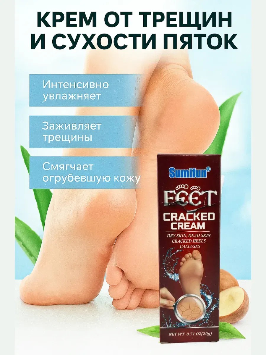 Крем от трещин обладает эффективным составом который превосходно борется с сухой кожей на руках и ногах, а так же, избавляет от натоптышей, мазолей и огрубевшей кожи. обладает регенерирующими свойствами и ускоряет заживление царапин, ссадин и порезов. смягчает поверхностный огрубевший слой кожи и активизирует процесс отделения омертвевших клеток эпидермиса.Продукт универсальный и подходит одновременно что бы убрать трещины на пятках, обеспечить комплексный уход и увлажнение, избавить от шелушений и мозолей.Масла, входящие в состав, глубоко питают и смягчают кожу, делая её эластичной и упругой.