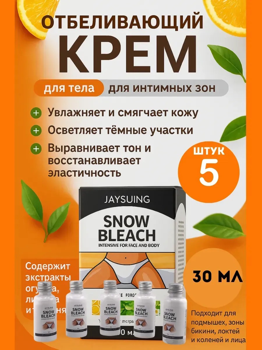 Отбеливающий крем JAYSUING Snow Bleach — это эффективное средство для выравнивания тона кожи и борьбы с пигментацией на чувствительных участках тела. Благодаря натуральному составу крем подходит для отбеливания интимной зоны, подмышек, локтей, коленей и даже лица.