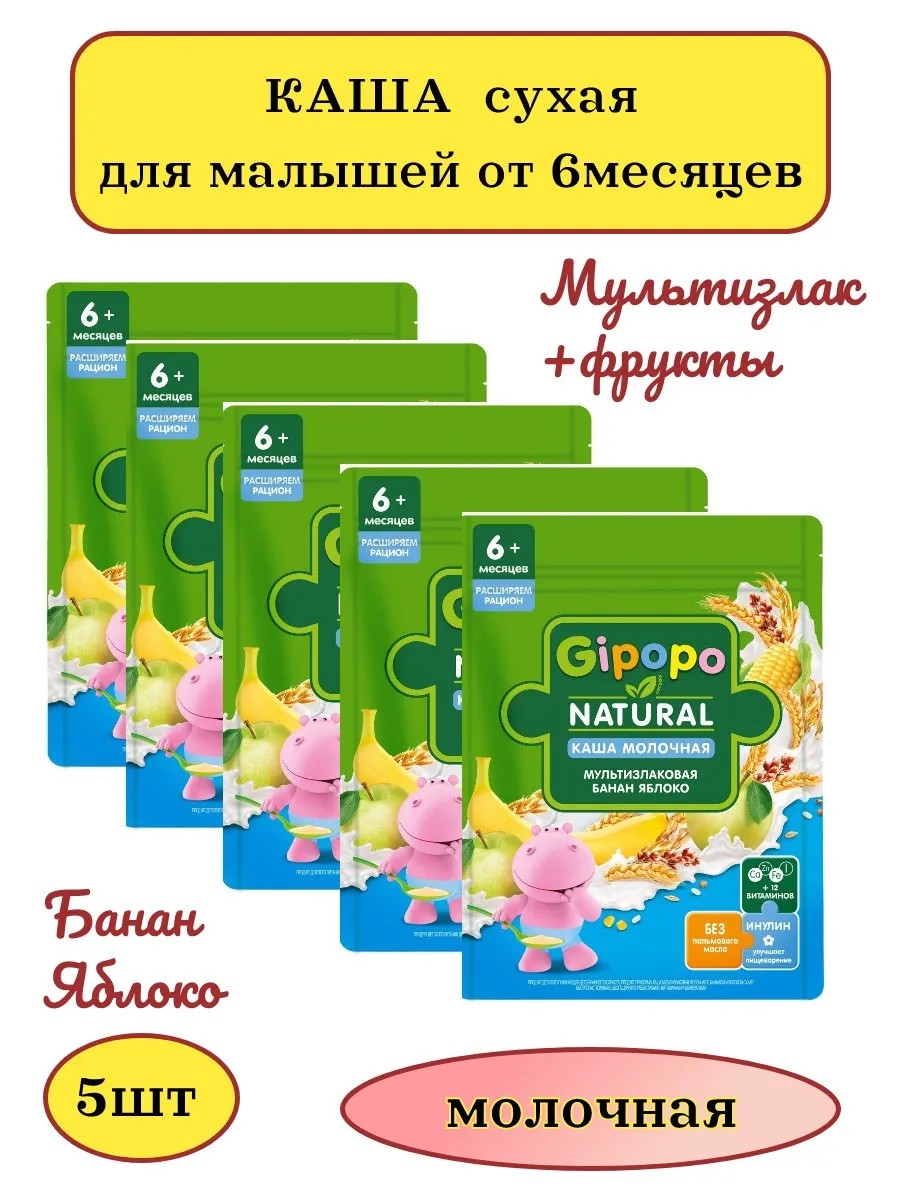 Молочная мультизлаковая каша с фруктами (яблоко, банан) Gipopo является источником белка и содержит всё необходимое для активного роста и развития малыша. Фруктовые молочные каши Гипопо разнообразят рацион малыша с 6 месяцев и познакомят его с новыми вкусами и сочетаниями. Детские мультизлаковые каши содержат белки для нормального развития мышц, 12 витаминов, а также железо, кальций, цинк и йод. Детские каши с фруктами Gipopo имеют сбалансированный состав: - Источники белка и энергии - Витамины и минералы для активного роста - Инулин для комфортного пищеварения - Без пальмового масла - Без консервантов, красителей и ароматизаторов - Удобный формат упаковки с zip-локом. Бережная паровая обработка сохраняет полезные свойства злаков, содержит 100% натуральные злаки.