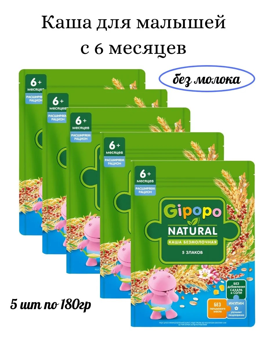 Каша сухая Gipopo безмолочная 5 злаков, 180г. Расширяем рацион. Продукт детского питания для детей раннего возраста, продукт прикорма с 6 месяцев. Каша мультизлаковая безмолочная сухая быстрорастворимая, обогащенная пребиотиками.