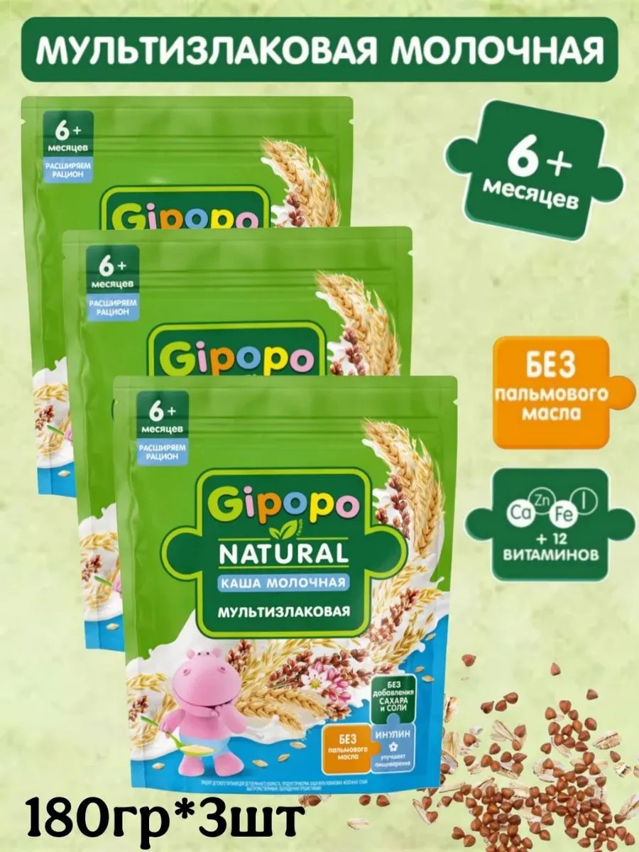 Каша молочная детская мультизлаковая GIPOPO оптимально подходит для постепенного знакомства малыша с новыми сочетаниями. В ее состав входят несколько зерновых культур, они дают энергию и всё необходимое для роста и развития. Каши детские молочные GIPOPO имеют сбалансированный состав: - Без добавления сахара и соли - Без пальмового масла - Без консервантов, красителей и ароматизаторов - Инулин для комфортного пищеварения - Удобный формат упаковки с zip-локом Польза злаков: бережная паровая обработка сохраняет полезные свойства злаков, содержит 100% натуральные злаки. Попробуйте также жидкие каши и фруктовые пюре GIPOPO. Создано экспертами, одобрено мамами.