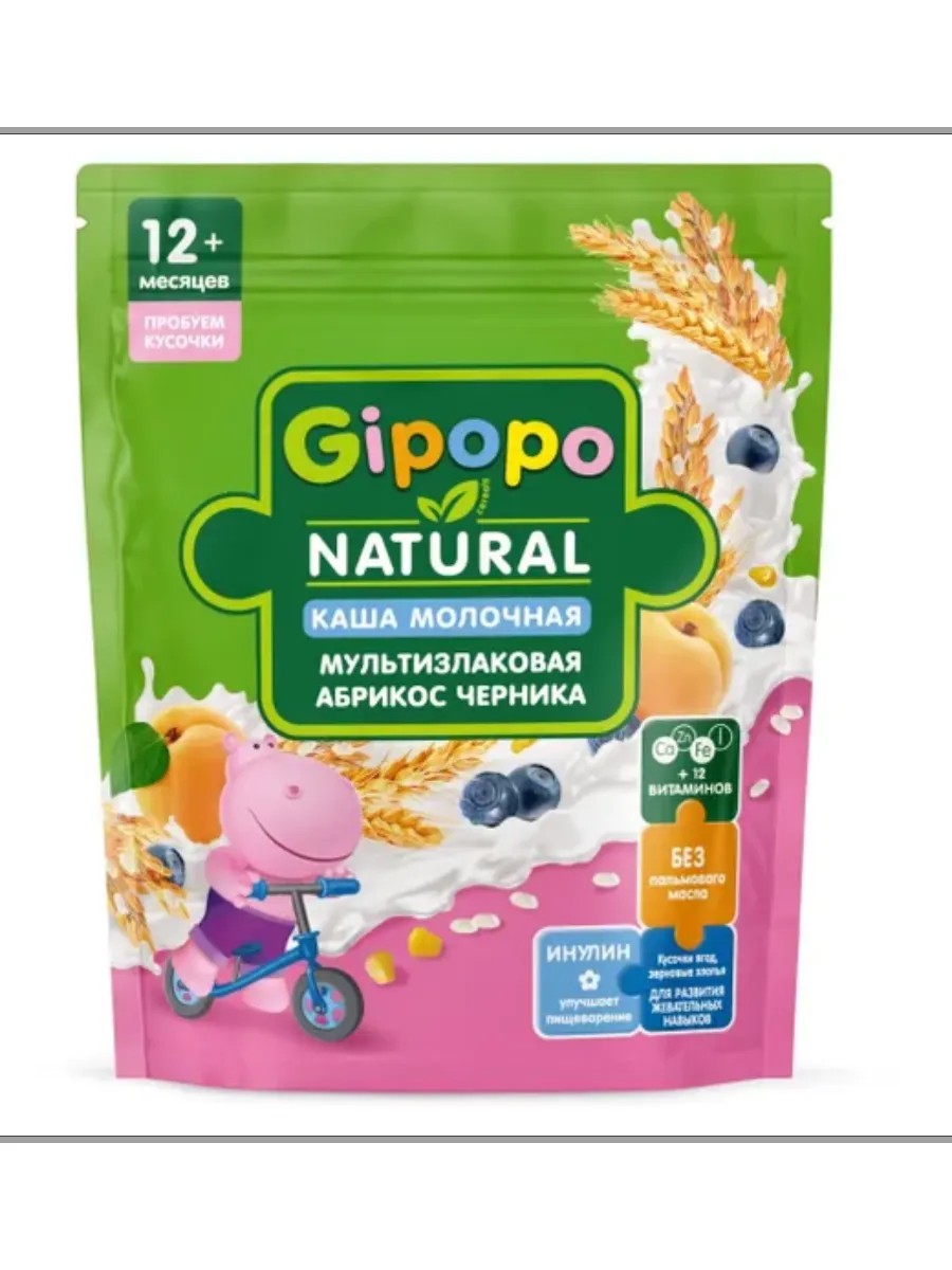 The benefits of cereals: gentle steaming preserves the beneficial properties of cereals, contains 100% natural cereals. Also try GIPOPO liquid porridges, fruit, meat, and meat-vegetable purees. Created by experts, approved by mothers. A baby food product for young children, a complementary food product. Multigrain milk porridge with plum, apricot, and blueberry, instant dry, enriched with prebiotics, vitamins, and minerals.