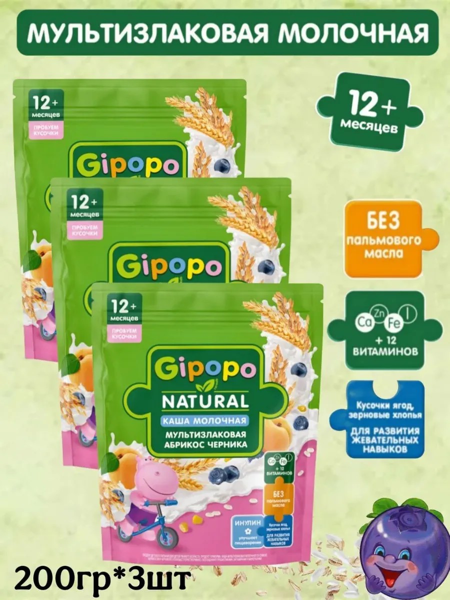 Каша детская молочная фруктовая мультизлаковая GIPOPO с кусочками абрикоса, хлопьями черники и зерновыми хлопьями разработана специально для малышей с 12 месяцев. С 12 месяцев малыш активно развивает навыки жевания. Каши GIPOPO ПРОБУЕМ КУСОЧКИ содержат кусочки фруктов и зерновые хлопья для развития жевательных навыков малыша. Сухие каши с кусочками помогают развить вкусовые привычки и делают рацион ребенка более разнообразным. Детские каши мультизлаковые с кусочками GIPOPO имеют сбалансированный состав: - Витамины и минералы для активного роста - Кусочки ягод, зерновые хлопья для развития жевательных навыков - Инулин для комфортного пищеварения - Без пальмового масла - Без консервантов, красителей и ароматизаторов - Удобный формат упаковки с zip-локом Польза злаков: бережная паровая обработка сохраняет полезные свойства злаков, содержит 100% натуральные злаки. Попробуйте также жидкие каши, фруктовые, мясные и мясорастительные пюре GIPOPO. Создано экспертами, одобрено мамами.