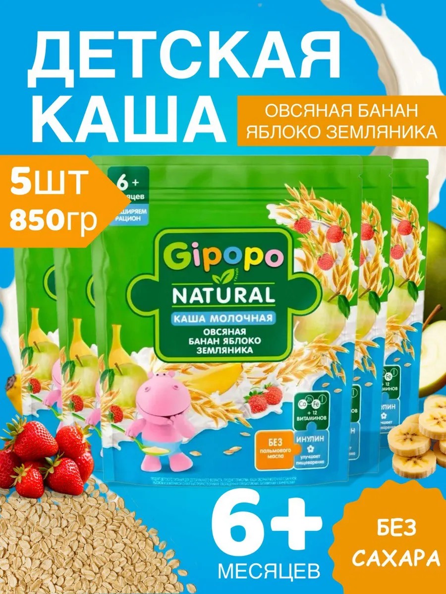 GIPOPO/ГИПОПО Каша 850г молочная овсяная Банан/яблоко/земляника пауч 6м+. Молочная овсяная каша с фруктами GIPOPO РАСШИРЯЕМ РАЦИОН является источником белка и содержит всё необходимое для активного роста и развития малыша. Фруктовые молочные каши GIPOPO разнообразят рацион малыша и познакомят его с новыми вкусами и сочетаниями. Детские овсяные каши содержат белки для нормального развития мышц, 12 витаминов, а также железо, кальций, цинк и йод. Детские каши с фруктами GIPOPO имеют сбалансированный состав: - Источники белка и энергии - Витамины и минералы для активного роста - Инулин для комфортного пищеварения - Без пальмового масла - Без консервантов, красителей и ароматизаторов - Удобный формат упаковки с zip-пакетом Польза злаков: бережная паровая обработка сохраняет полезные свойства злаков, содержит 100% натуральные злаки. Попробуйте также жидкие каши и фруктовые пюре GIPOPO. Создано экспертами, одобрено мамами