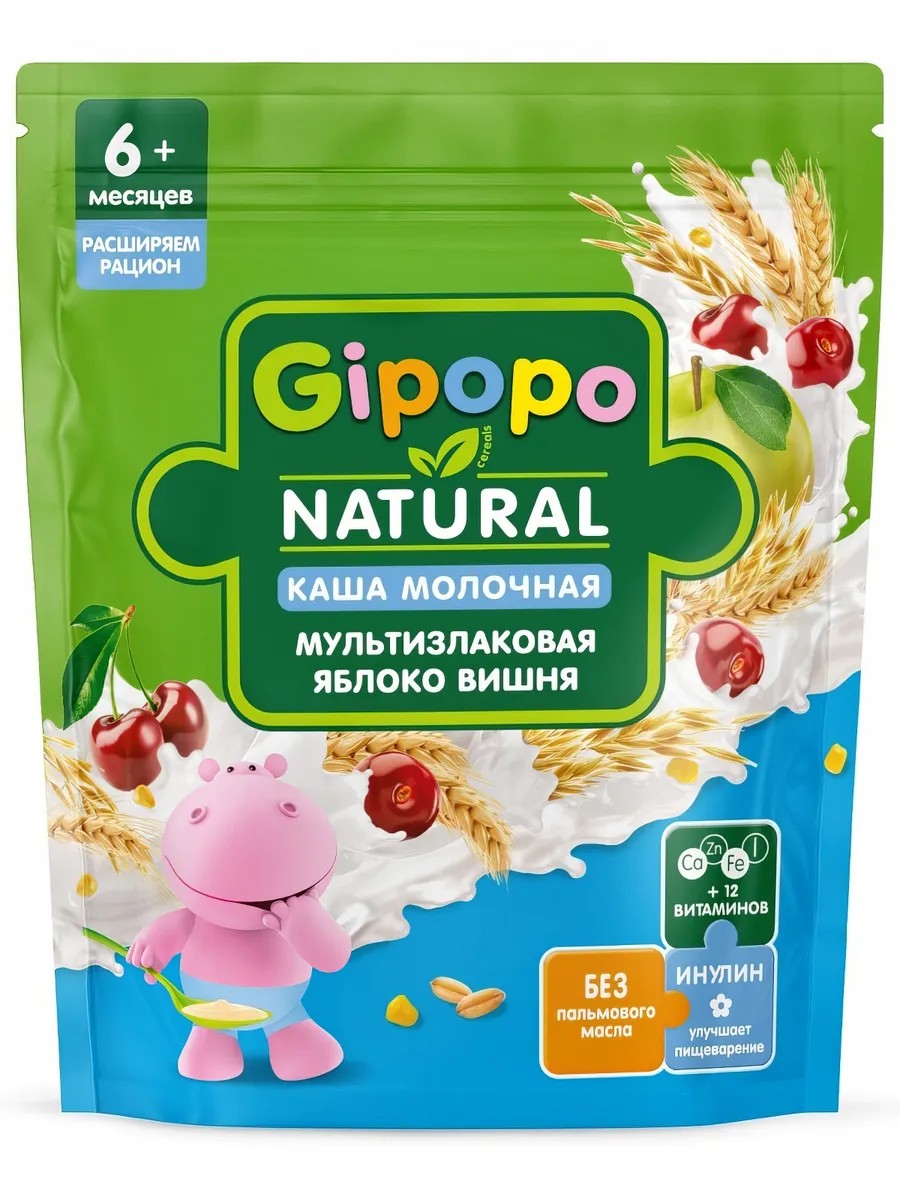 Gipopo Multigrain Milk Porridge with Fruits Expands the Diet is a source of protein and contains everything necessary for the active growth and development of the baby. Gipopo Fruit Milk Porridges will diversify the baby's diet and introduce them to new tastes and combinations. Children's multigrain cereals contain proteins for normal muscle development, 12 vitamins, as well as iron, calcium, zinc and iodine. Gipopo Baby Porridges with Fruits have a balanced composition: - Sources of protein and energy; - Vitamins and minerals for active growth; - Inulin for comfortable digestion; - No palm oil; - No preservatives, colors or flavors; - Convenient zip-lock packaging. The benefits of cereals: gentle steam processing preserves the beneficial properties of cereals, contains 100% natural cereals. Also try Gipopo liquid cereals and fruit purees. Created by experts, approved by moms.