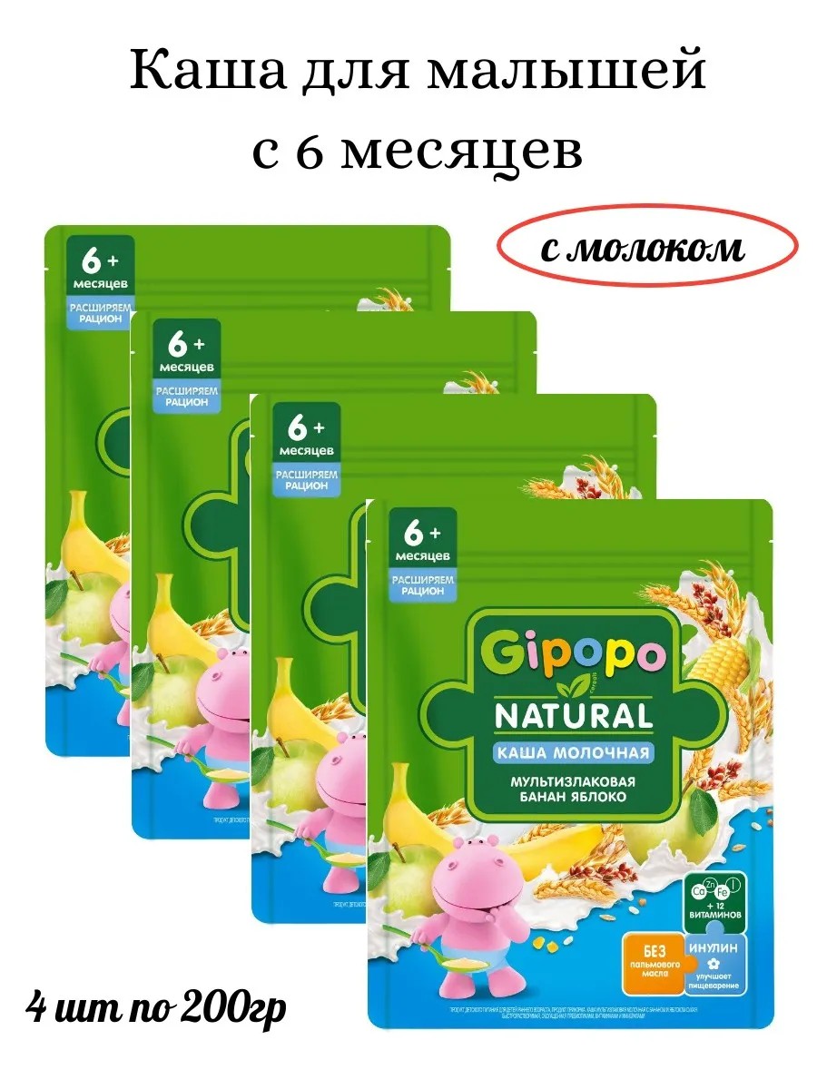 Gipopo Multigrain Milk Porridge with Banana and Apple, 200g. Expanding the diet. A baby food product for infants aged 6 months and older, a complementary food. This instant, multigrain milk porridge with banana and apple is enriched with prebiotics, vitamins, and minerals. Ingredients: vitamins C, PP, E, pantothenic acid, B6, B2, B1, A, folic acid, D3, biotin, B12, and the minerals calcium, iron, zinc, and iodine.