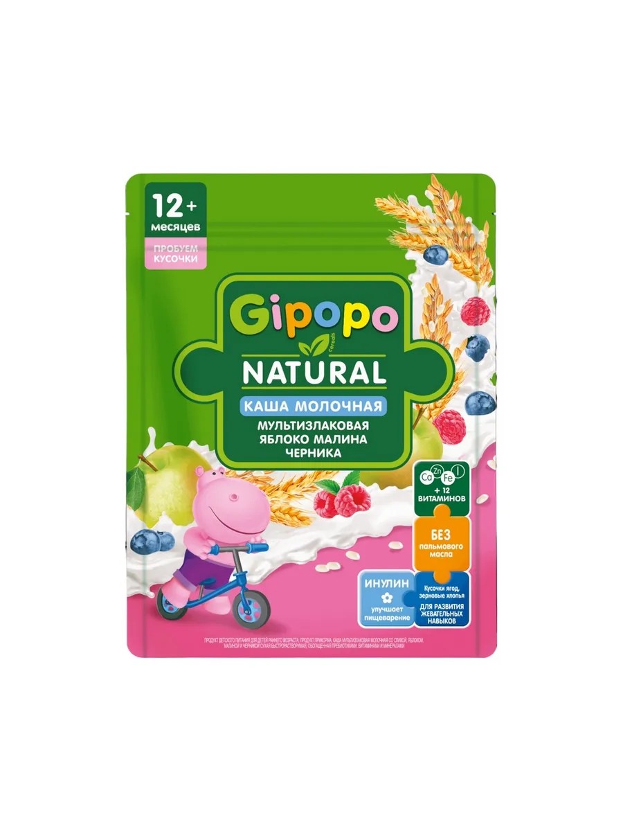 Каша детская молочная фруктовая мультизлаковая GIPOPO с кусочками малины, хлопьями черники и зерновыми хлопьями разработана специально для малышей с 12 месяцев. С 12 месяцев малыш активно развивает навыки жевания. Каши GIPOPO ПРОБУЕМ КУСОЧКИ содержат кусочки ягод и зерновые хлопья для развития жевательных навыков малыша. Сухие каши с кусочками помогают развить вкусовые привычки и делают рацион ребенка более разнообразным. Детские каши мультизлаковые с кусочками GIPOPO имеют сбалансированный состав: - Витамины и минералы для активного роста - Кусочки ягод, зерновые хлопья для развития жевательных навыков - Инулин для комфортного пищеварения - Без пальмового масла - Без консервантов, красителей и ароматизаторов - Удобный формат упаковки с zip-локом Польза злаков: бережная паровая обработка сохраняет полезные свойства злаков, содержит 100% натуральные злаки. Попробуйте также жидкие каши, фруктовые, мясные и мясорастительные пюре GIPOPO. Создано экспертами, одобрено мамами.