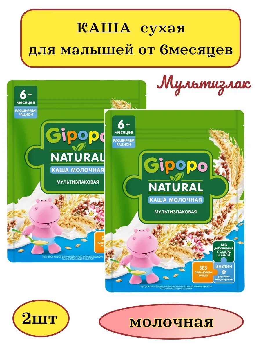 ipopo multigrain milk porridge is a source of protein and contains everything necessary for the active growth and development of the baby. Gipopo milk porridges will diversify the diet of a baby from 6 months and introduce them to new tastes and combinations. Multigrain baby cereals contain proteins for normal muscle development, 12 vitamins, as well as iron, calcium, zinc, and iodine. Gipopo baby cereals have a balanced composition: - Sources of protein and energy - Vitamins and minerals for active growth - Inulin for comfortable digestion - No palm oil - No preservatives, colors, or flavors - Convenient zip-lock packaging. Gentle steam processing preserves the beneficial properties of cereals, contains 100% natural grains. Contains natural sugars.