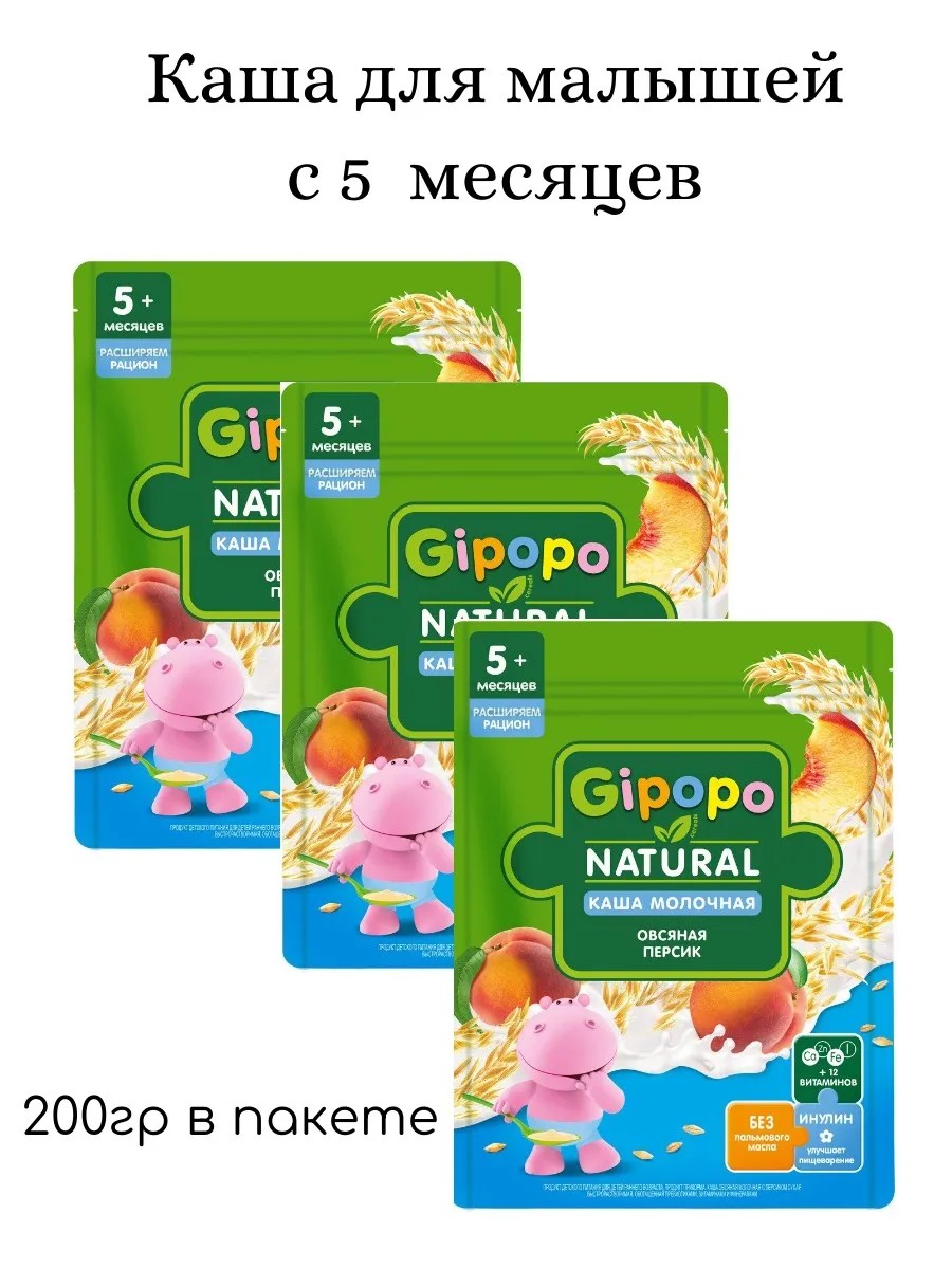 Каша сухая Gipopo Овсяная молочная Персик, 200г. Расширяем рацион. Продукт детского питания для детей раннего возраста с 5 месяцев, продукт прикорма. Каша овсяная молочная с персиком сухая быстрорастворимая, обогащенная пребиотиками, витаминами и минералами. В составе: витамины С, РР, Е, пантотеновая кислота, В6, В2, В1, А, фолиевая кислота, D3, биотин, В12, минеральные вещества кальций, железо, цинк, йод.