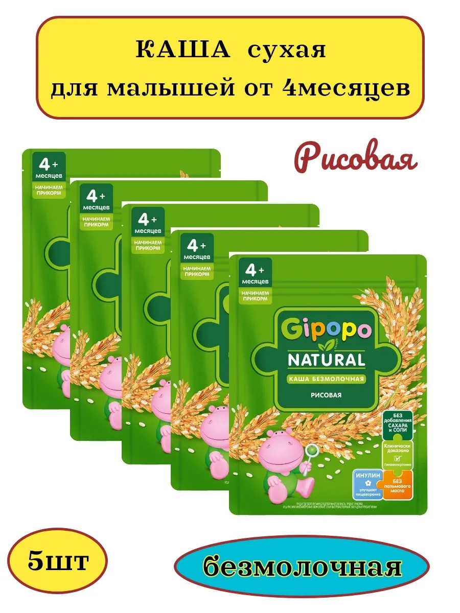 Первый прикорм – важное событие для родителей и малыша. Низкоаллергенная каша детская безмолочная рисовая Gipopo разработана для правильного начала прикорма вашего малыша с 4-х месяцев. Детские рисовые каши обеспечивают полноценное насыщение, легко усваиваются, не раздражая стенки кишечника Сложные углеводы дают ребенку необходимую энергию для нормального развития, а клетчатка стимулирует пищеварение. - Клинически доказано - гипоаллергенно - Без добавления сахара и соли - Без пальмового масла - Инулин для комфортного пищеварения - Удобный формат упаковки с zip-локом. Бережная паровая обработка сохраняет полезные свойства злаков, содержит 100% натуральные злаки