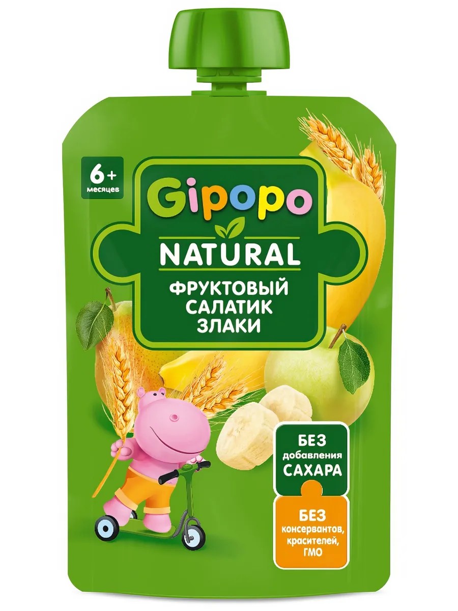 Детские фруктовые пюре со злаками Gipopo в удобной упаковке - пауче подходят для питания малышей с 6 месяцев. В состав пюре Фруктовый салатик и злаки Gipopo входят только натуральные пюре из фруктов и злаки рисовая, овсяная и гречневая мука. Фрукты разнообразят рацион малыша, познакомят его с новыми вкусами, злаки содержат растительные белки. Детские фруктовые пюре Gipopo: - Без добавления сахара; - Без консервантов, красителей, ГМО; - Удобная мягкая упаковка-пауч. Пюре в мягкой упаковке дополняет рацион в процессе взросления удобно взять с собой. Создано экспертами, одобрено мамами.