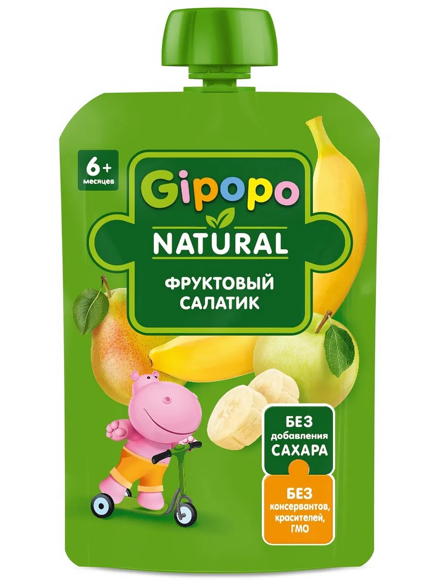 Детское фруктовое пюре Gipopo в удобной упаковке - пауче подходят для питания малышей с 6 месяцев. В состав Фруктового салатика Gipopo входят пюре из яблок, груш и бананов. Фрукты разнообразят рацион малыша, познакомят его с новыми вкусами. Для пюре мы отбираем сочные и спелые фрукты, которые позволяют получить необходимые витамины и минералы. Детские фруктовые пюре Gipopo: - Без добавления сахара; - Без консервантов, красителей, ГМО; - Удобная мягкая упаковка-пауч. Пюре в мягкой упаковке дополняет рацион в процессе взросления удобно взять с собой. Создано экспертами, одобрено мамами.