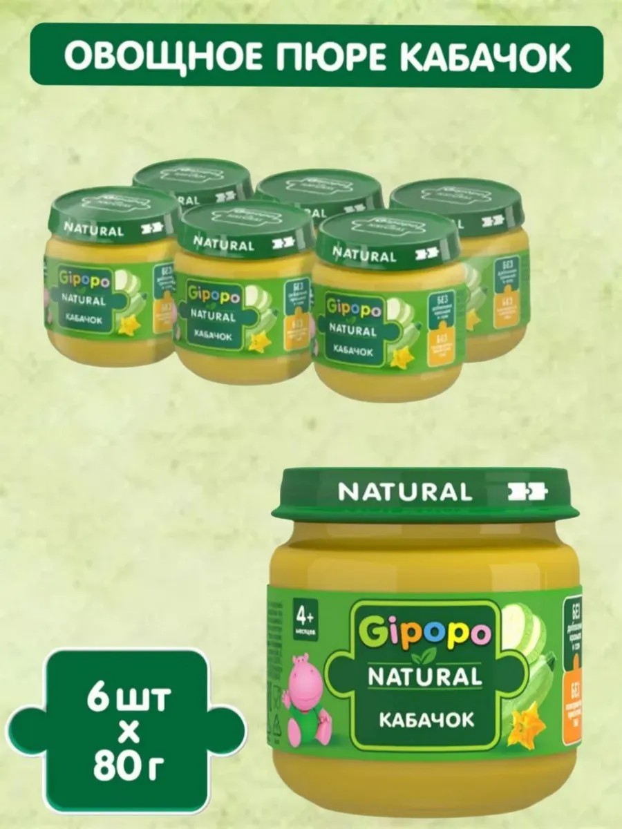 Пюре овощное детское из кабачка GIPOPO создано для первого прикорма малышей с 4 месяцев.