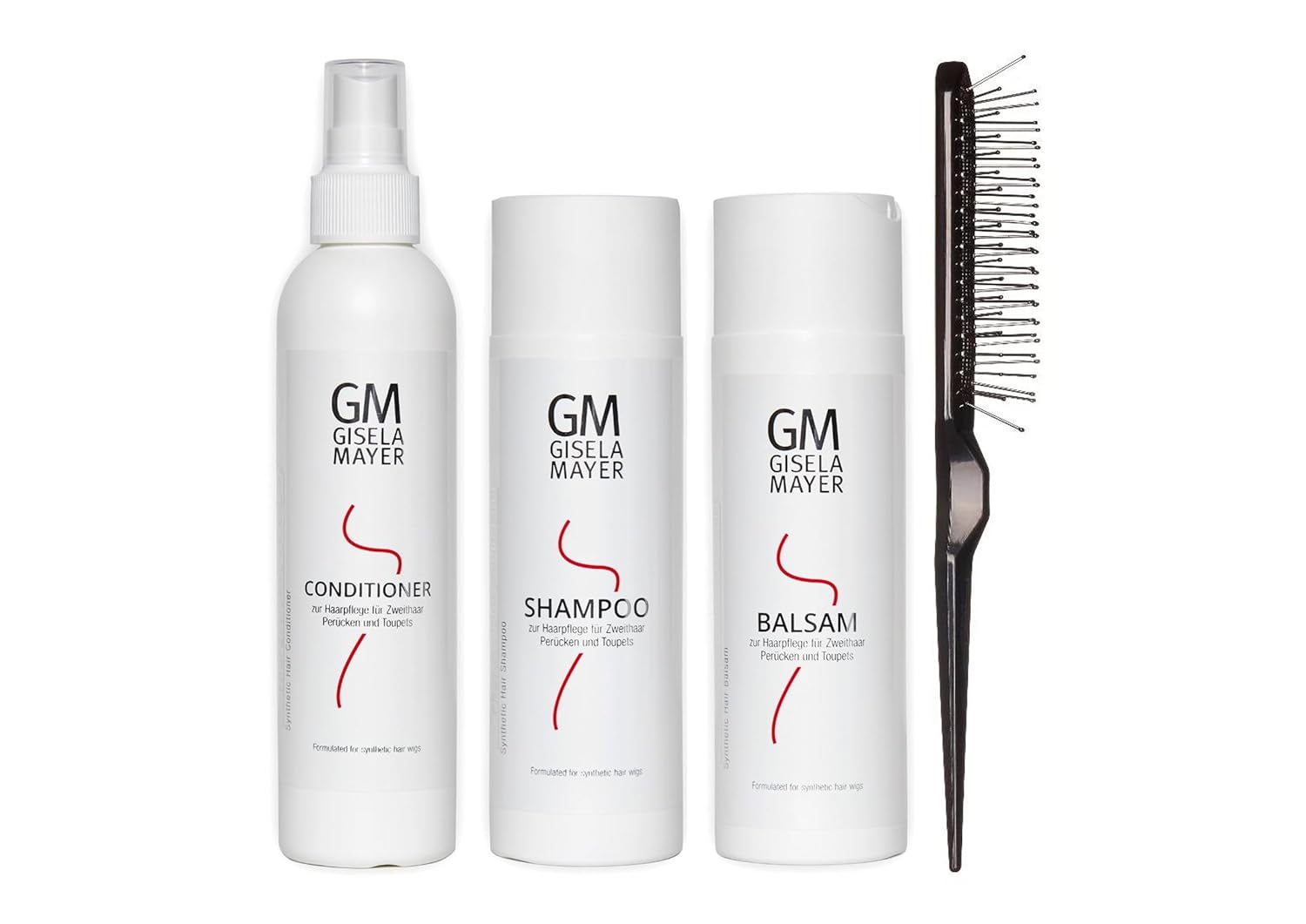 Gisela Mayer Shampoo 200 ml. Special shampoo for all wigs and hairpieces made of synthetic hair. Gisela Mayer balm 200 ml special balm for all wigs and hairpieces made of synthetic hair. It provides soft and supple hair and provides a special shine. Gisela Mayer Conditioner 200 ml Special care spray for all wigs and hairpieces made of synthetic hair. A protective coat protects against the acidity of the skin and keeps the hair supple. Brush with nubs, 3-row brush with nubs that protect the finish of your second hair. Perfect for gentle combing or grooming and with narrow tapered handle for separating hair areas. How often do I wash my wig? In general, you should always wash your wig when the fabric or hair is greasy or dirty, it no longer smells fresh or the hair falls stringly. Because it is important that you feel comfortable with your wig all around. However, in order to keep it as long as possible, you should not overdo it with washing. "As often as necessary and as little as possible" is a good motto. Sometimes it is enough to use a little shine spray and give the hair fresh fragrance and shine without washing. How to wash a synthetic hair wig? A synthetic wig does not tolerate heat, so you should wash it cold or lukewarm. To do this, soak the wig with a little synthetic hair shampoo in a lukewarm water bath. Wash the wig carefully and never be rubbed or wrung. After about 15 minutes, it should be rinsed thoroughly with clean water. Please never brush the wig when wet, but put it on a towel to dry. Dab the wig and do not blow dry. When the wig has dried, place