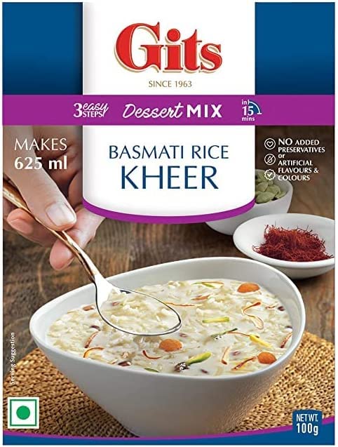 Gits Basmati rice kheer is one of the most well-liked fast mixes, and Indian desserts like Basmati rice kheer are scrumptious, flavorful, and rich. Gits Basmati rice kheer , a delicious Indian treat, offers a taste of the genuine article. For conversational cravings, holiday celebrations, and family get-togethers, the Gits Instant Basmati rice kheer Mix is the ideal answer. ready to prepare mix for Basmati rice kheer sweet that is completely vegetarian, free of artificial flavours or colours, and preservative-free With a satisfying, hearty meal made with the Gits Instant Basmati rice kheer Mix. It is a wholesome dish made with only premium ingredients. This saffron and cardamom-flavored thick and creamy kheer is topped with almond, pistachio, and raisins. This mouthwatering Indian dessert mixture can be made in three simple steps in 15 minutes.  Features:   * A popular Indian dessert made from milk and rice  * Garnished with almond pistachios and raisins   * Flavoured with saffron and cardamom   * Makes luscious and irresistible Basmati rice kheer   * A healthy and wholesome meal  * Easy to carry anywhere  * Comes in a stand-up box  * Hygienically packed.  * Preservative-free, artificial colour and flavour-free dish  * Makes 625mlWELL PACKED: Delicious & Tasty Basmati rice kheer is prepared, processed and packed in a very hygienic condition to ensure better quality and authentic flavour. Natural & Pure, Mouth-watering Flavor & Aroma Premium pre packed prime quality Basmati rice kheer . READY IN 3 EASY STEPS IN JUST 15 MINUTES: Stir and boil the milk after adding the contents of the packet. Once prepared, garnish with pistachios and almonds and serve hot or cold. Store in a clean, dry area. MOUTHWATERING TASTE: This traditional Indian namkeen snack features a luscious and irresistible taste, made to satisfy the cravings for sweet foods. Almond, pistachio, and raisins are sprinkled on top of this rich, creamy kheer with flavours of saffron and cardamom. FAVOURITE INDIAN DESSERT MADE FROM MILK AND RICE: a popular rice and milk treat in India. Kheer is a rich, creamy dessert topped with almond, pistachio, and raisins that have been spiced with saffron and cardamom. MILK-BASED INDIAN DELICACY: Instant Kheer Mix is a delectable milk and rice-based Indian dessert that is frequently served as a sweet side dish with lunch or supper. It is made using the finest dry fruits and freshest ingredients.