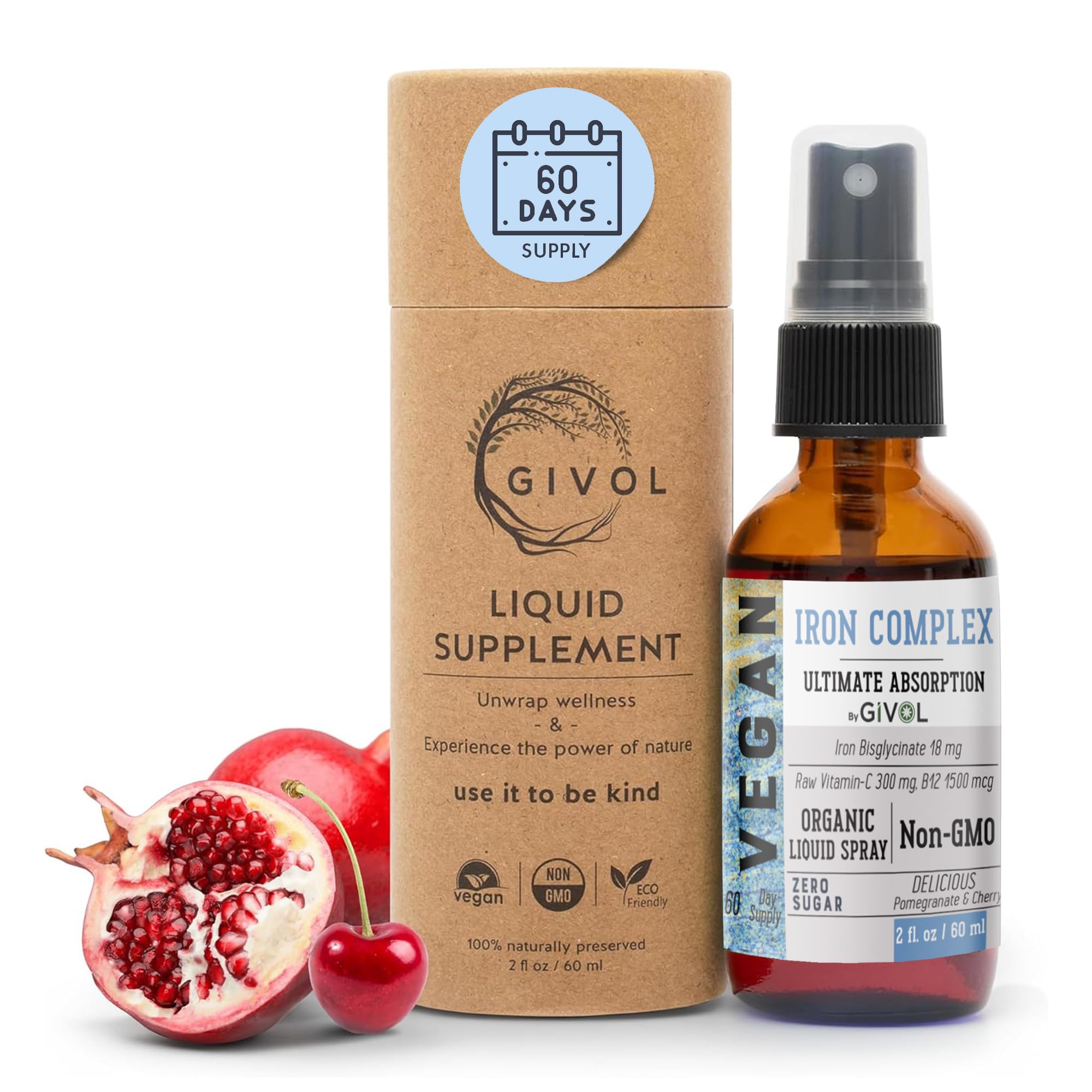 SUPERIOR QUALITY: Join the countless individuals who have experienced the premium quality and potency of GIVOL Iron Supplement. Our product is meticulously formulated to ensure maximum effectiveness and safety. Trusted by individuals of all ages, from busy professionals to active seniors, our iron supplement is a reliable choice for supporting overall well-being. Experience the difference with GIVOL Iron Supplement and take charge of your health today. CONVENIENT AND CLEAN SUPPLEMENTING: Our commitment to quality extends to every aspect of our product, including its formulation and ingredients. Our vegan-friendly, Non-GMO, and sugar-free spray offers a clean and convenient way to supplement your iron intake. No more swallowing bulky pills or dealing with unpleasant aftertastes. With GIVOL Iron Supplement, you can easily incorporate iron support into your daily routine, promoting vitality and resilience with every spray. GENTLE ON THE STOMACH, SUITABLE FOR ALL AGES: We understand the importance of a gentle yet effective iron supplement, which is why our formula is specifically designed to be easy on the stomach. Whether you're a busy professional, a multitasking parent, or a growing child, our gentle formula provides daily iron support without the risk of digestive upset or discomfort. You can trust GIVOL Iron Supplement to deliver the nutrients your body needs, without any unnecessary side effects. COMPREHENSIVE IMMUNE AND ENERGY SUPPORT: With the inclusion of Vitamin C B12 in our enhanced formula, our liquid spray goes beyond just boosting iron absorption. Vitamin C is a powerful antioxidant that supports immune system health by neutralizing harmful free radicals, while Vitamin B12 is essential for energy production and nerve function. Together, they create a synergistic blend that not only fortifies your body's defenses but also enhances vitality and overall well-being. ADVANCED ABSORPTION FOR MAXIMUM BENEFITS: Our GIVOL Iron Supplement is meticulously crafted with an 18mg Bisglycinate Complex, a superior form of iron known for its exceptional absorption rates. Take 8 sprays sublingually, daily, for maximum absorption and effectiveness. This ensures that your body can efficiently utilize the iron, providing comprehensive support for energy metabolism and immune system function. Say goodbye to low energy levels and susceptibility to illness with our advanced absorption formula.