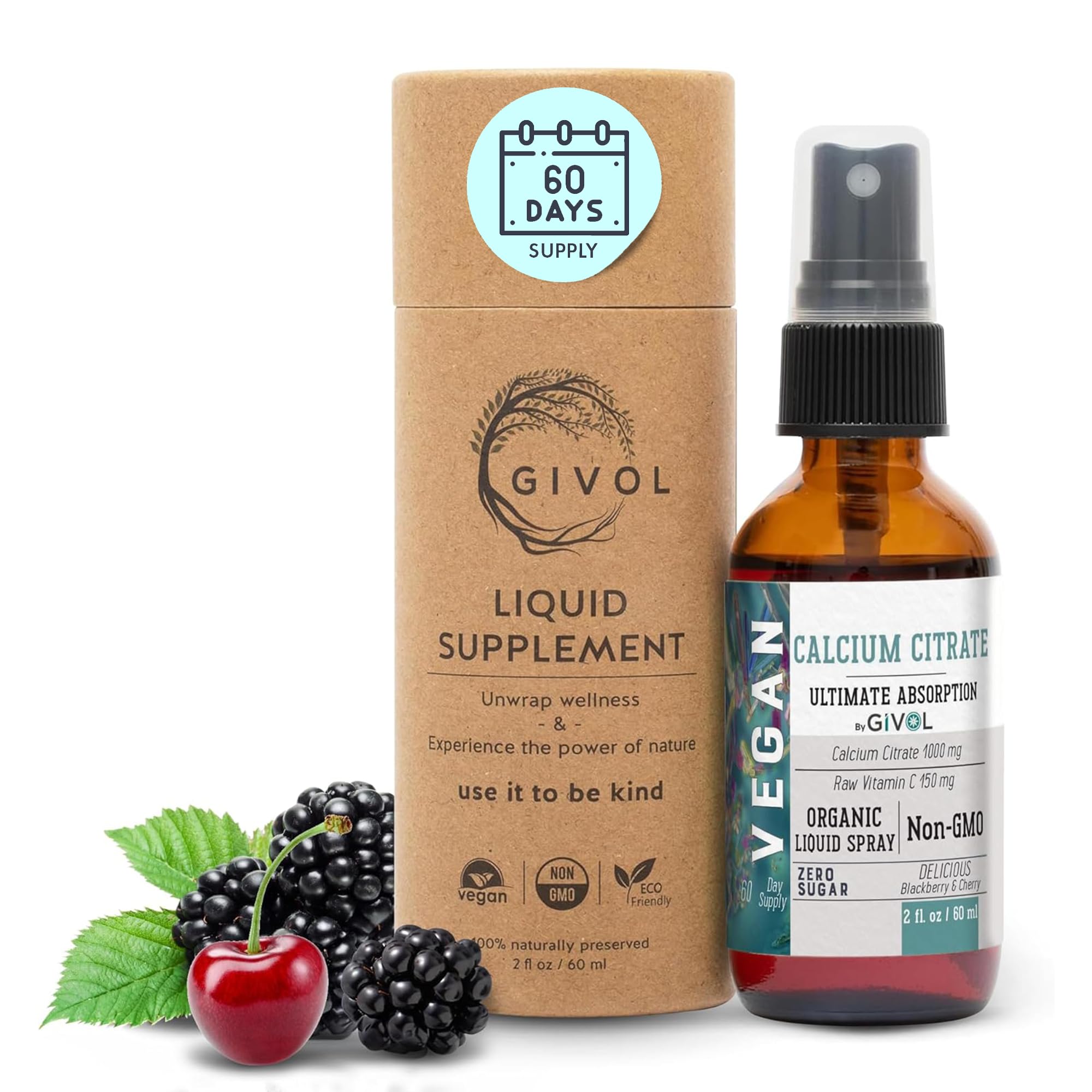 GIVOL Liquid Calcium Citrate 1000mg & Raw Vitamin C 150mg Liquid Spray Mist for Optimal Absorption Wild Cherry & BlackBerry Flavor Calcium Supplement Non-GMO Gluten Free Sugar-Free 2oz (60ml)