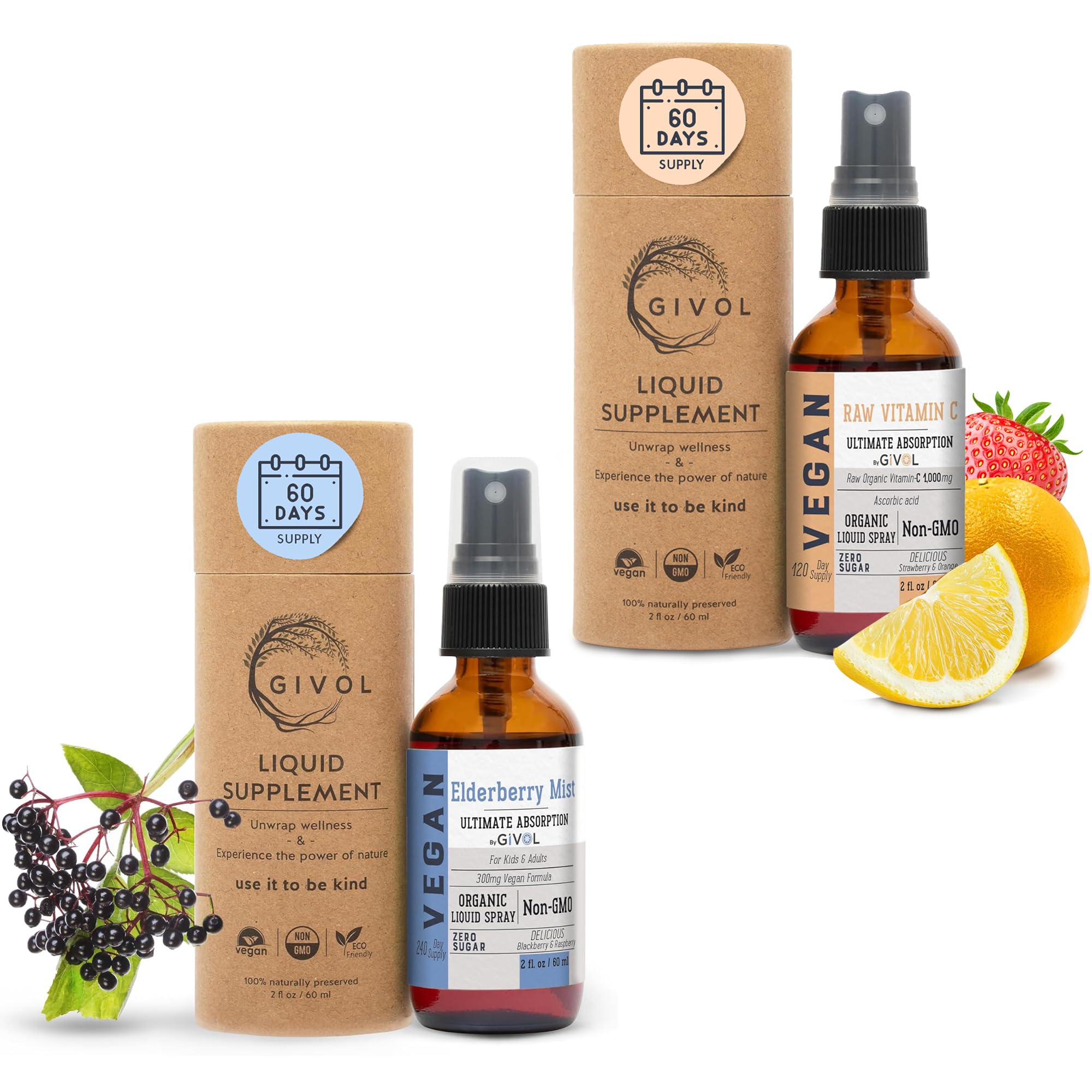 Discover the pure, potent power of GIVOL Organic Elderberry Mist, a superior health supplement designed to fit seamlessly into any wellness routine. Sourced from only the highest quality organic elderberries, our non-GMO, vegan-friendly formula is completely free from artificial additives and preservatives, ensuring that every drop delivers nothing but nature's best. The versatility of this mist makes it a perfect addition to a variety of beverages—from enriching smoothies and juices to enhancing your favorite tea or simply stirring into water. Experience the full spectrum of elderberry benefits with every versatile sip, tailored to support not just immunity but also a holistic health experience. GIVOL's dedication to quality is matched by our commitment to nutritional efficacy. Our elderberry spray is enriched with a robust profile of essential minerals and nutrients, providing more than just Vitamin C support—it's a comprehensive source of iron and other vital minerals necessary for daily health. Crafted in the USA with the utmost care and quality control, each spray is designed to deliver a balanced blend of nutrients, optimizing your nutrient intake with convenience and ease. Whether you follow a plant-based lifestyle or simply seek a reliable, daily health supplement, GIVOL's Vitamin C spray mist is an ideal choice, offering a simple, effective way to incorporate essential nutrients into your daily routine, promoting overall wellness with every spray.VERSATILE WELLNESS SUPPORT: GIVOL Organic Elderberry Mist enhances your daily health regimen with its multipurpose use. Ideal for blending into smoothies, teas, or just water, our elderberry extract offers more than just immune support. Enjoy the benefits of a vegan-friendly, non-GMO formula, free from artificial additives, ensuring purity in every spray. NATURAL CITRUS INFUSION: Enjoy the refreshing taste of nature with our blend of real fruit extracts in Lemon, Orange, and Strawberry flavors. Our spray mist offers an enjoyable way to take your daily Vitamin C, and it's vegan, ensuring it aligns with a variety of dietary preferences. ADVANCED ABSORPTION TECHNOLOGY: GIVOL's Vitamin C Spray Mist utilizes advanced technology for superior absorption. Enriched with Ascorbic Acid, this liquid extract ensures maximum Vitamin C benefits for daily wellness. It's easy to use: just a few sprays directly into the mouth each day. Plus, our formula is organic and made in the USA. EASY ABSORPTION: Our liquid extract formulation ensures quick and efficient absorption, making it ideal for individuals seeking rapid immune support. Whether you're on-the-go or at home, GIVOL Organic Elderberry Mist provides convenient, hassle-free supplementation. POWERFUL IMMUNE SUPPORT: GIVOL Organic Elderberry Mist is crafted from premium Sambucus Nigra, known for its potent immune-boosting properties. With high flavonoid levels, it fortifies your body's defenses naturally, offering protection for both kids and adults.