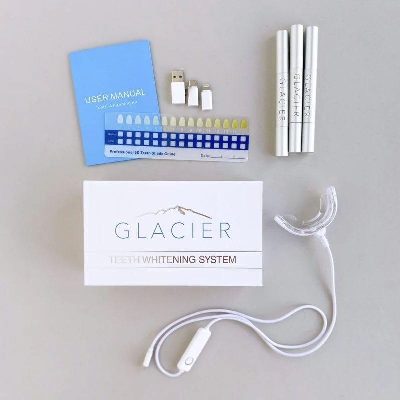 Transform your smile with the Glacier Teeth Whitening System, a complete at-home teeth whitening solution designed for convenience and effectiveness. This comprehensive kit includes three extra-strength whitening pens and a versatile LED whitening mouthpiece that connects easily to any USB 3, Android, or Apple device. Perfect for busy individuals, the system delivers noticeable results in just 16 minutes, making it ideal for those seeking professional-quality whitening on their own schedule. The kit comes complete with a professional 3D teeth shade guide to track your progress and a detailed user manual for step-by-step guidance. The whitening formula is carefully balanced to deliver powerful results while being gentle enough for those with sensitive teeth. Whether you're preparing for a special occasion or simply maintaining your bright smile, this all-in-one system provides everything needed for a confident, radiant smile from the comfort of your home.