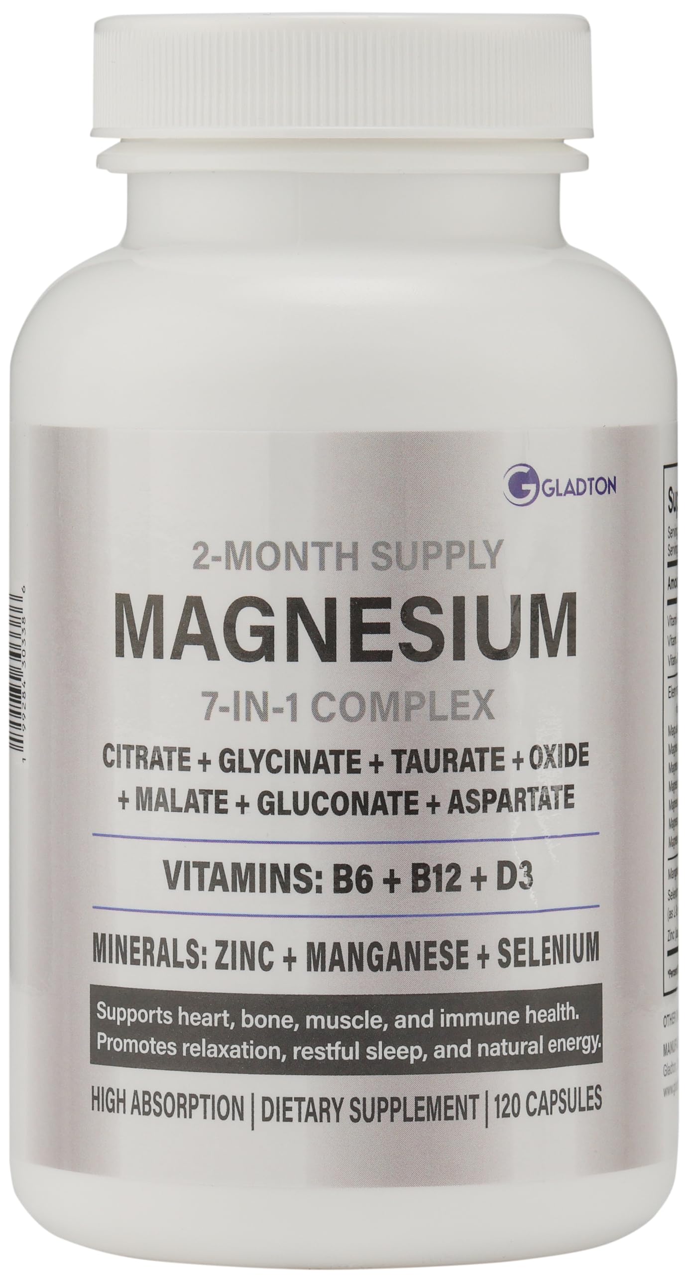 Boost your wellness with Gladton High Absorption Magnesium Complex Supplement 445mg. Expertly formulated with 7 forms of magnesium—Citrate, Glycinate, Malate, Aspartate, Taurate, Gluconate, and Oxide—plus essential vitamins and minerals including B6, B12, D3, Zinc, Selenium, and Manganese. This premium magnesium supplement supports your body and mind by promoting better sleep, muscle relaxation, heart health, and stress management. Our high absorption magnesium complex ensures maximum bioavailability, helping your body efficiently absorb and utilize this essential mineral. Ideal for anyone looking to support healthy bones, cardiovascular function, nervous system balance, and daily vitality. With 120 easy-to-swallow capsules, you get a convenient 2-month supply of this powerful supplement. Take control of your wellness naturally with Gladton Magnesium Complex, your daily ally for energy, relaxation, and overall wellbeing.