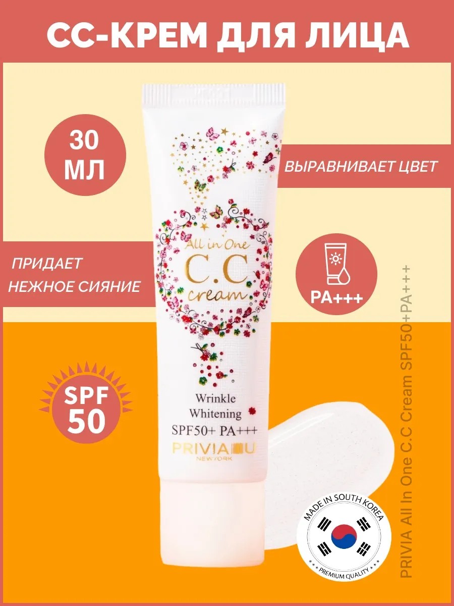 Корейский тональный крем Privia All in One для идеального макияжа, камуфлирования недостатков на лице и вашей уверенности в себе. Легкая текстура тонального крема для лица подходит для всех типов кожи, в том числе для жирной. CC крем ровно ложится на коже, обеспечивает ровный тон, прекрасно матирует и скрывает любые недостатки: прыщи, пигментные пятна, гематомы, порезы, шрамы. При этом крем тональный для лица не сушит кожу и обеспечивает полноценный уход. Преимущество тонального крема — коллаген в составе. Он способствует выработке натурального коллагена, делая кожу упругой, подтянутой, разглаживая мелкие мимические морщины. Этот СС крем уникальный и многофункциональный. В состав входят SPF компоненты для защиты кожи от негативного воздействия ультрафиолета. Нанося коллаген тональный крем, вы не только полностью скрываете любые недостатки, но и заботитесь о своей коже, делая ее более сияющей и ухоженной. Тональный крем Корея не жирный, подходит для женщин любого возраста. Крем тональный можно наносить на кожу пальцами, кистью, профессиональным спонжем, мягко растушевывая. CC крем для лица податливый, прекрасно равняется, не создавая липкую пленку. Наносите корейский тональный крем с утра и будьте уверены — в течение дня он не размажется, не станет скатываться, создавать эффект парника даже в знойный день. Тональный крем для лица Корея быстро высыхает, не оставляя следов на одежде. Чем бы вы ни занимались, СС крем Корея не подведет. Коллаген тональный крем сочетается с любой декоративной косметикой. Наносите средство для макияжа на базу, сочетайте с пудрой, хайлайтером и другими любимыми косметическими средствами. Корейский тональный крем адаптируется под любые текстуры и оттенки, всегда будет незаметным и неощутимым на коже. СС крем для лица в удобной тубе объемом 30 мл. Компактный и эргономичный, обеспечивает экономию расхода, помещается в любую косметичку.