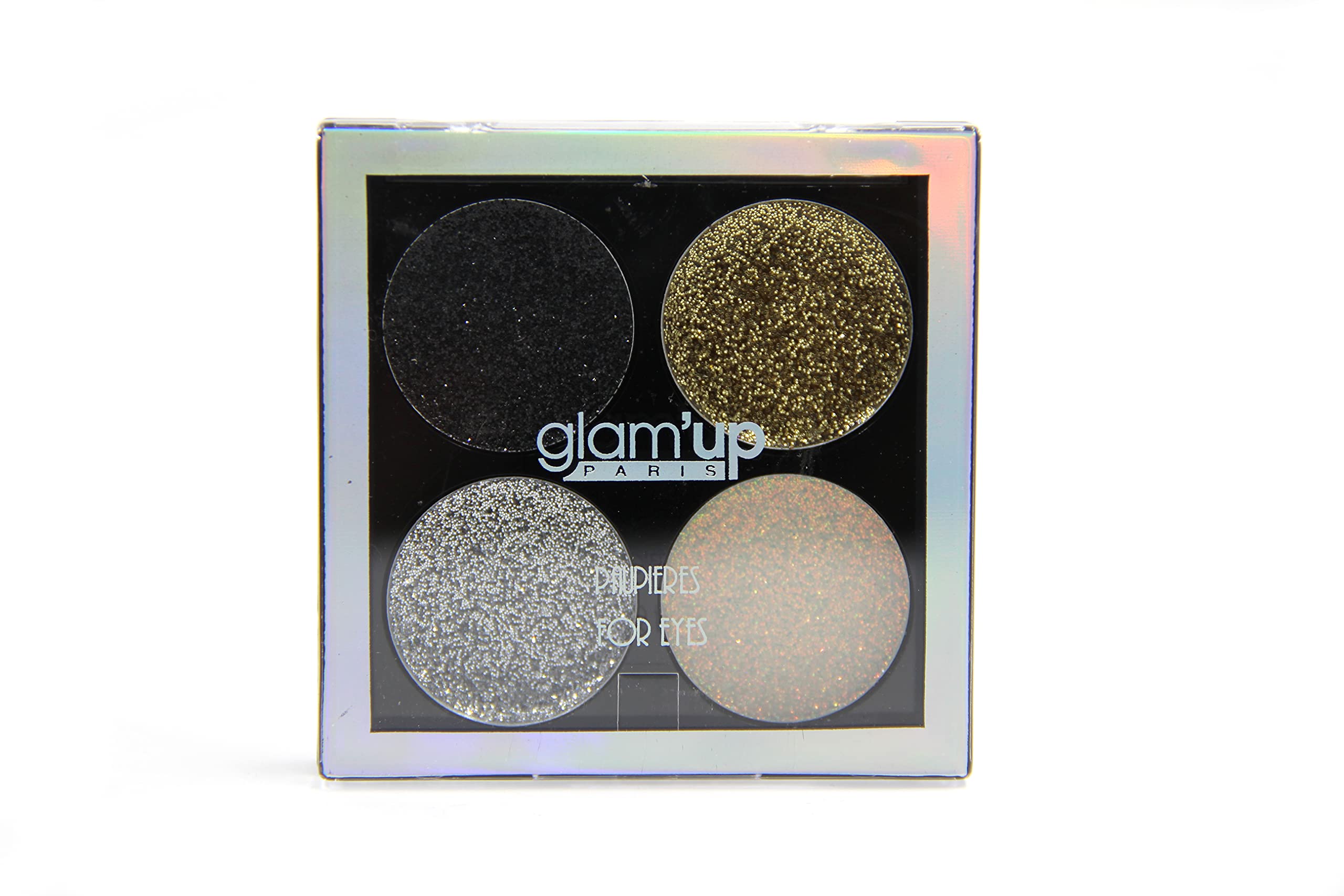 A palette of four glittery eyeshadow shades. Made with a myriad of pearls, the glittery eyeshadow brings a festive touch to any look while enhancing the eyes with light thanks to its glitter effect. It brings together four iridescent glitter shades with multi-dimensional reflections. INSTRUCTIONS FOR USE Application tips: Apply your Eye Glitter to the entire eyelid for a sparkling result, or in small touches to illuminate the eyes more naturally. Perfect application using the Glam'Up Paris angled and precision brushes. SAFETY WARNING Keep out of reach of children Application tips: Apply your Eye Glitter all over the eyelid for a shimmering result, or in small touches to brighten the eyes more naturally. Perfect application using the Glam'Up Paris angled and precision brushes. Gel texture for precise application and long-lasting hold. It combines four shades of iridescent glitter with multi-dimensional reflections. Composed of a myriad of pearls, the glittery eyeshadow brings a festive touch to any look while enhancing the eyes with light thanks to its glitter effect. A palette of four shades of glittery eyeshadows. Une palette de quatre teintes d'ombres pailletées. Composé d'une myriade de nacres, le fard à paupière pailleté apporte une touche festive à n'importe quel look tout en rehaussant le regard de lumière grâce à son effet glitter. Il réunit quatre teintes de paillettes irisées aux reflets mullti-dimensionnels. MODE D'EMPLOI Conseils d'application : Appliquez votre Eye Glitter sur l'ensemble de la paupière, pour un résultat brillantissime, ou bien par petites touches pour illuminer le regard plus naturellement. Application parfaite à l'aide des pinceaux biseautés et précision Glam'Up Paris. AVERTISSEMENT DE SÛRETÉ Laisser hors de portée des enfants Conseils d'application : Appliquez votre Eye Glitter sur l'ensemble de la paupière, pour un résultat brillantissime, ou bien par petites touches pour illuminer le regard plus naturellement. Application parfaite à l'aide des pinceaux biseautés et précision Glam'Up Paris. Texture gel pour une application précise et une tenue longue durée. Il réunit quatre teintes de paillettes irisées aux reflets mullti-dimensionnels. Composé d'une myriade de nacres, le fard à paupière pailleté apporte une touche festive à n'importe quel look tout en rehaussant le regard de lumière grâce à son effet glitter. Une palette de quatre teintes d'ombres pailletées.