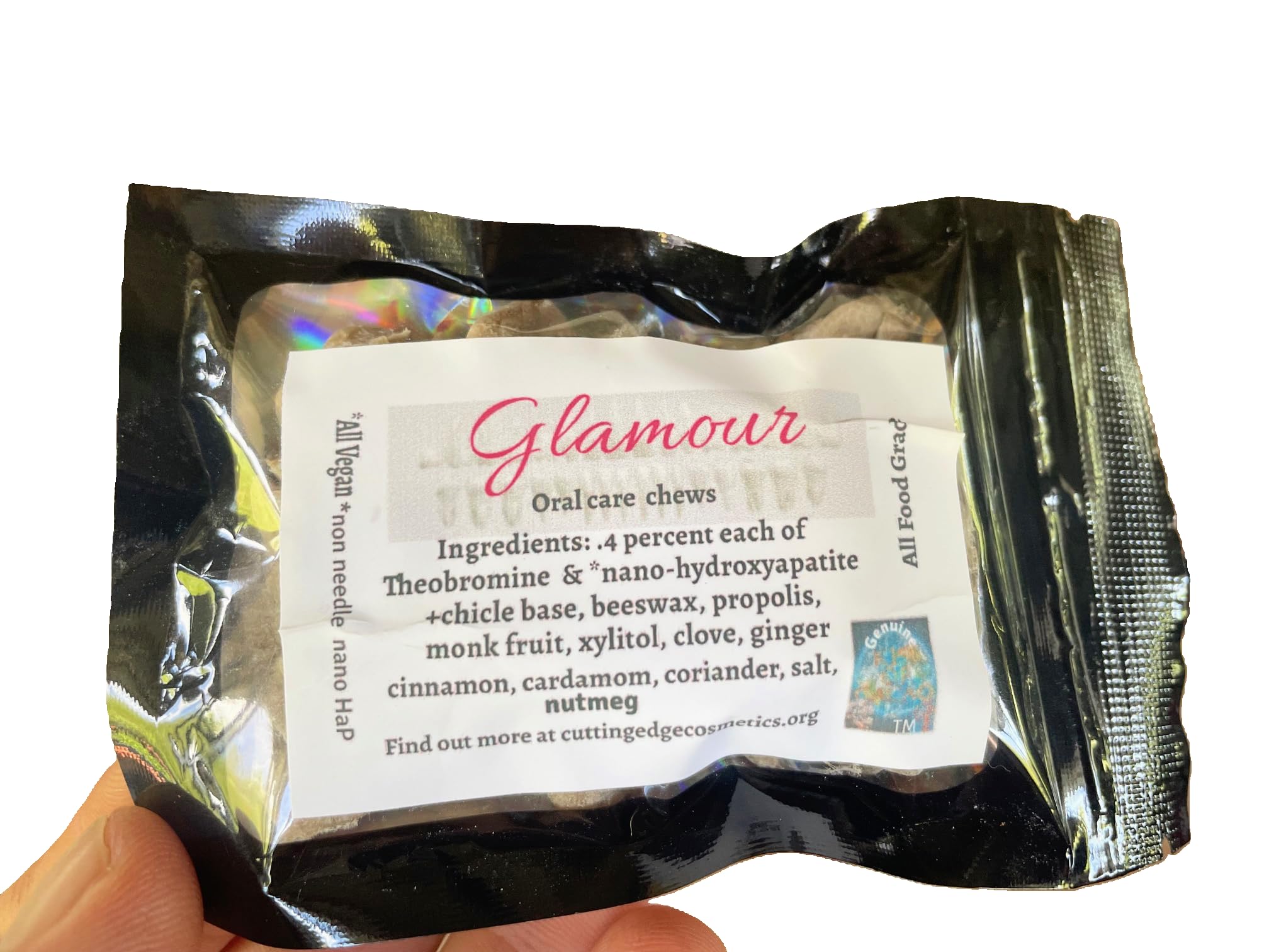 Glamour oral care chews: featuring natural chicle/beeswax base + theobromine nanohydroxyapatite for enamel remineralization support (abstract 2.2) fresh spices propolis-sweetned with monk fruit- Large pack (40 grams) cha
