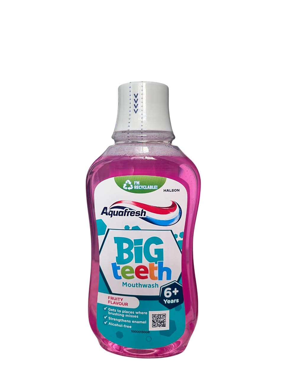 Aquafresh My Big Teeth Mouthwash 300 ml Mouthwash for children with fluoride. Reaches places that are inaccessible to the brush. Strengthens the enamel. Does not contain alcohol. Complete protection for children from 6 years.Aquafresh My Big Teeth Mouthwash 300 ml.Aquafresh Big Teeth 6 Mondvloeistof 300 ml Aquafresh My Big Teeth Mouthwash 300 ml Mondwater voor kinderen met fluoride. Bereikt plaatsen die niet toegankelijk zijn voor de borstel. Versterkt het glazuur. Bevat geen alcohol. Volledige bescherming voor kinderen vanaf 6 jaar.Aquafresh My Big Teeth Mouthwash 300 ml.