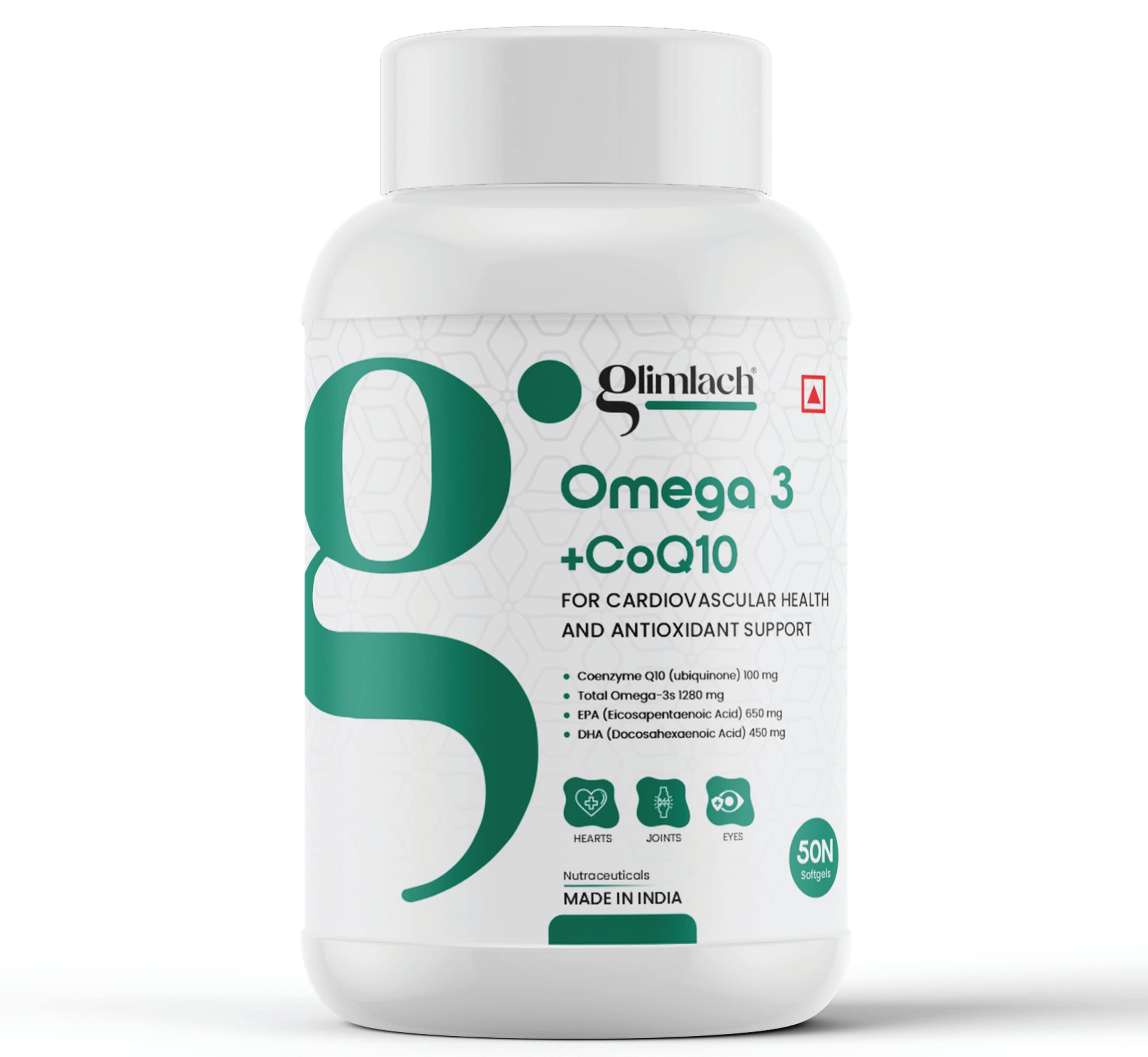 GLIMLACH Omega CoQ10 is a high-quality omega-3 and CoQ10 supplement that provides 1280 mg of omega-3 fatty acids, including EPA and DHA, in each serving. It also contains 100 mg of CoQ10, a powerful antioxidant that supports heart health and immune function. The supplement is made in the INDIA with non-GMO ingredients and is free from gluten, dairy, and soy. It is easy to take, with just 2 soft gel per serving, and is suitable for adults who want to improve their overall health and well-being.