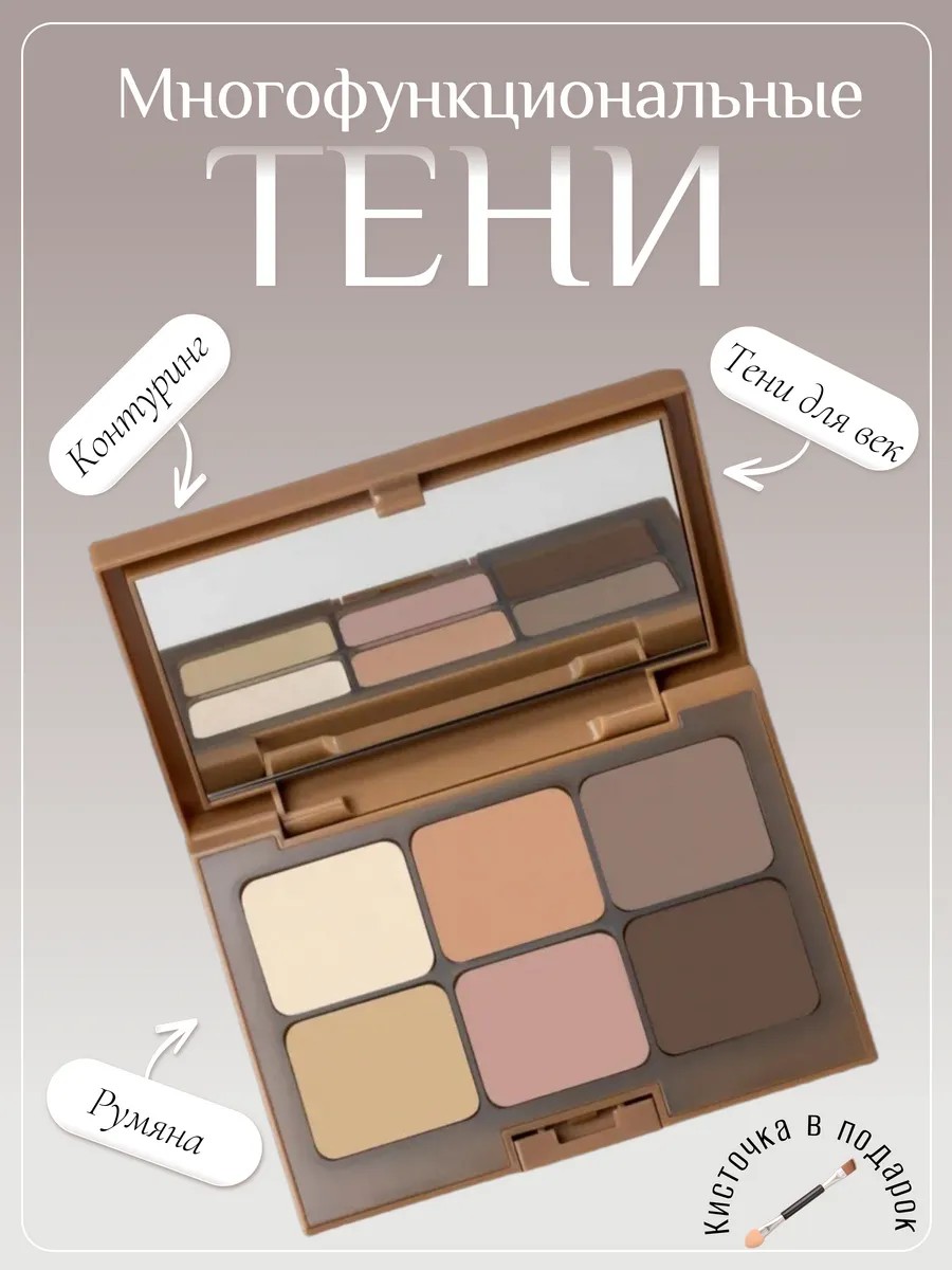 We present to you a universal 3-in-1 palette, which includes eyeshadow, blush, and contouring. This multifunctional palette allows you to create both a delicate nude daytime makeup look and a vibrant, striking evening look. The set includes 6 harmoniously selected shades with matte and shimmer finishes that blend easily and adhere beautifully to the skin.
