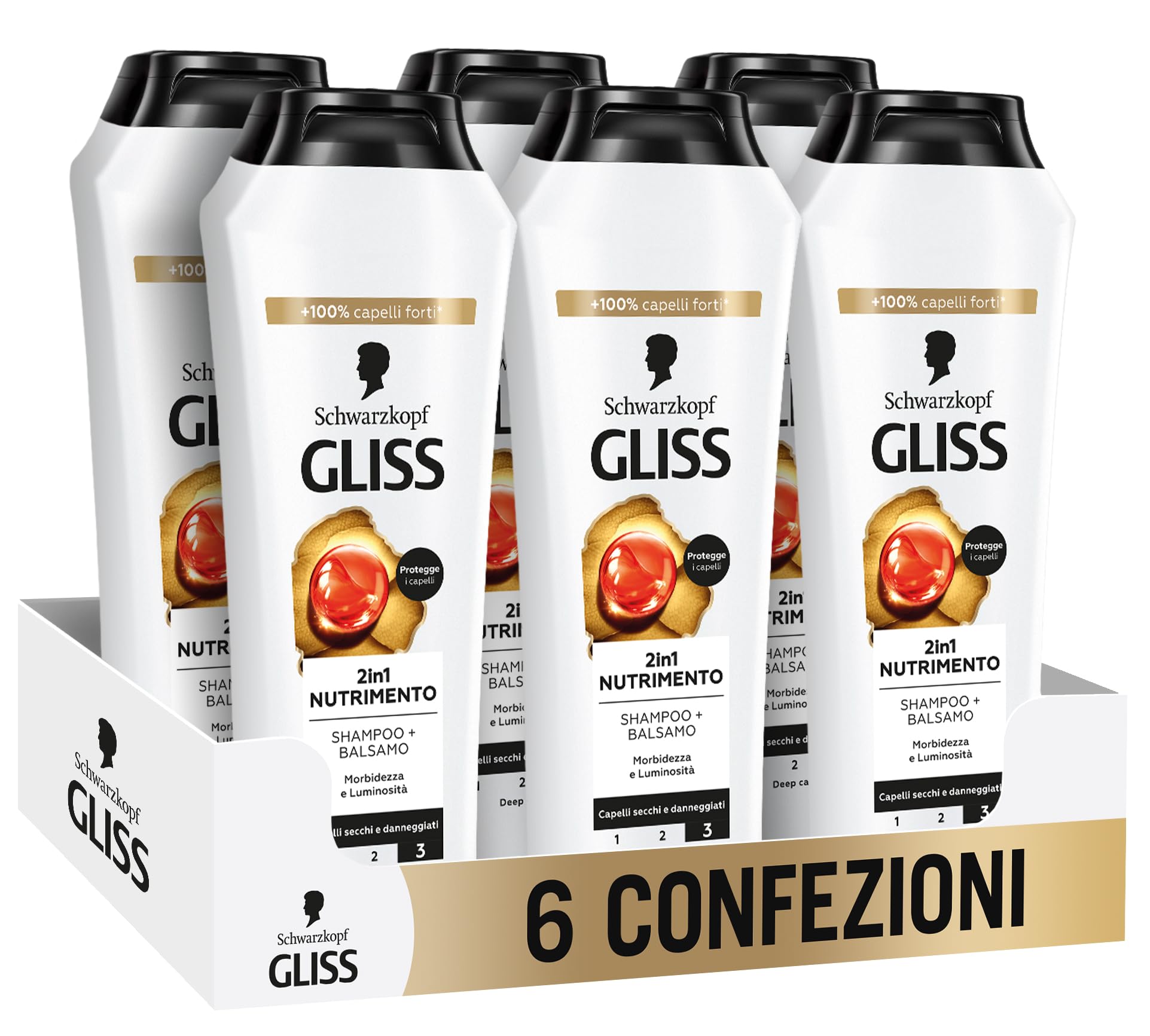 Schwarzkopf Gliss Nourishing 2-in-1 Shampoo Conditioner - Softness and shine for dry and damaged hair. Daily life exposes hair to multiple stressors that can leave it weak and dull. To restore its natural beauty, it needs nourishment. Gliss Nourishing 2-in-1 Shampoo Conditioner combines the action of hydrolyzed keratin and floral nectar to protect hair fibers, making them visibly healthier and restoring their natural beauty. Gliss Care Level: 3 – Deep Care with deeply restorative formulas and high-performance ingredients. Gliss Nourishing 2-in-1 shampoo for dry hair protects hair and reduces breakage . This treatment for damaged hair also protects and strengthens hair, leaving it soft, shiny, and healthy-looking. With an enveloping musky fragrance. 88 of the ingredients in the Keratin Treatment are of natural origin . Gliss hair products are PETA-approved . Application: Gently massage into wet hair. Rinse thoroughly. Use regularly. Product Benefits: Restructuring shampoo for soft, shiny hair For dry and damaged hair Gliss Care Level 3 - Deep Care 100 Stronger Hair With hydrolyzed keratin and floral nectar 88 of ingredients of natural origin Bottle made with 80 recycled plastic. vs. untreated hair incl. water Excl. cap and label. More information on our website. DIRECTIONS Gently massage into wet hair. Rinse thoroughly. Use regularly.Contents: Schwarzkopf Gliss Nutriment 2-in-1 Shampoo Conditioner, 6 x 250ml bottles, keratin shampoo for dry and brittle hair, Deep Care level. For the planet: Gliss Shampoo and Conditioner is formulated with 88 naturally derived ingredients and its bottle is made from 80 recycled plastic . 2-in-1 nourishment: This shampoo for dry and damaged hair provides deep repair, reduces breakage , and strengthens hair fibers. With keratin: Formulated for dry and damaged hair, Gliss Nutriment hair products with hydrolyzed keratin and floral nectar provide softness and shine. Softness and shine: Gliss keratin shampoo cleanses, nourishes, and protects hair, leaving it soft, shiny, and restoring its natural beauty.Gliss Schwarzkopf Gliss, 2 en 1 Shampooing et revitalisant nutrition, cheveux sains, douceur et luminosité, pour cheveux normaux, avec kératine hydrolysée et nectar florale, lot de 6 x 250 mlDESCRIPTION DU PRODUIT DESCRIPTION DU PRODUIT Schwarzkopf Gliss Nourriture 2 en 1 Shampooing Après-shampoing - Douceur et luminosité pour cheveux secs et abîmés. La vie quotidienne expose les cheveux à de multiples stress qui peuvent les rendre faibles et ternes. Pour restaurer leur beauté naturelle, il est nécessaire de les nourrir. Gliss Nutriment Shampooing Baume 2 en 1 combine l'action de kératine hydrolisée et nectar florale pour protéger les fibres des cheveux, les rendant visiblement plus sains et leur restituant leur beauté naturelle. Gliss Care Level: 3 – Deep Care avec des formules profondément réparatrices et des ingrédients hautement performants. Le shampooing pour cheveux secs Gliss Nutrimento 2 en 1 protège les cheveux et réduit les cheveux cassés . En outre, ce soin cheveux abîmés protège et renforce les cheveux, les laissant doux, brillants et l'aspect sain. Avec un parfum musqué enveloppant. 88 des ingrédients du traitement Kératine sont d'origine naturelle . Les produits capillaires Gliss sont approuvés PETA . Application: Masser doucement sur cheveux mouillés. Rincer abondamment. Utiliser régulièrement. Avantages du produit : Shampooing restructurant pour cheveux doux et lumineux Pour cheveux secs et abîmés Gliss Care Level 3 - Deep Care 100 Cheveux Forts Avec kératine hydrolisée et nectar florale 88 d'ingrédients d'origine naturelle Flacon fabriqué avec 80 plastique recyclé. vs. Cheveux non traités avec le produit incl. eau Excl. Bouchon et étiquette. Plus d'informations sur notre site. MODE D'EMPLOI Masser doucement sur cheveux mouillés. Rincer abondamment. Utiliser régulièrement.Contenu de la livraison : Schwarzkopf Gliss Nutriment 2 en 1 Shampooing Après-shampoing, 6 boîtes de 250 ml, shampoing à la kératine pour cheveux secs et cassés, Deep Care level. Pour la planète : Gliss Shampooing et Baume est formulé avec 88 d'ingrédients d'origine naturelle et son flacon est fabriqué à partir de 80 de plastique recyclé . Nourriture 2 en 1 : ce shampooing pour cheveux secs et abîmés offre une réparation profonde, réduit les cheveux cassés et renforce les fibres des cheveux. Avec kératine : formulés pour cheveux secs et abîmés, les produits cheveux Gliss Nutriment avec kératine hydrolisée et nectar florale apportent douceur et luminosité. Douceur et luminosité : le shampoing à la kératine Gliss nettoie, nourrit et protège les cheveux, les laissant doux et lumineux et restaurant leur beauté naturelle.