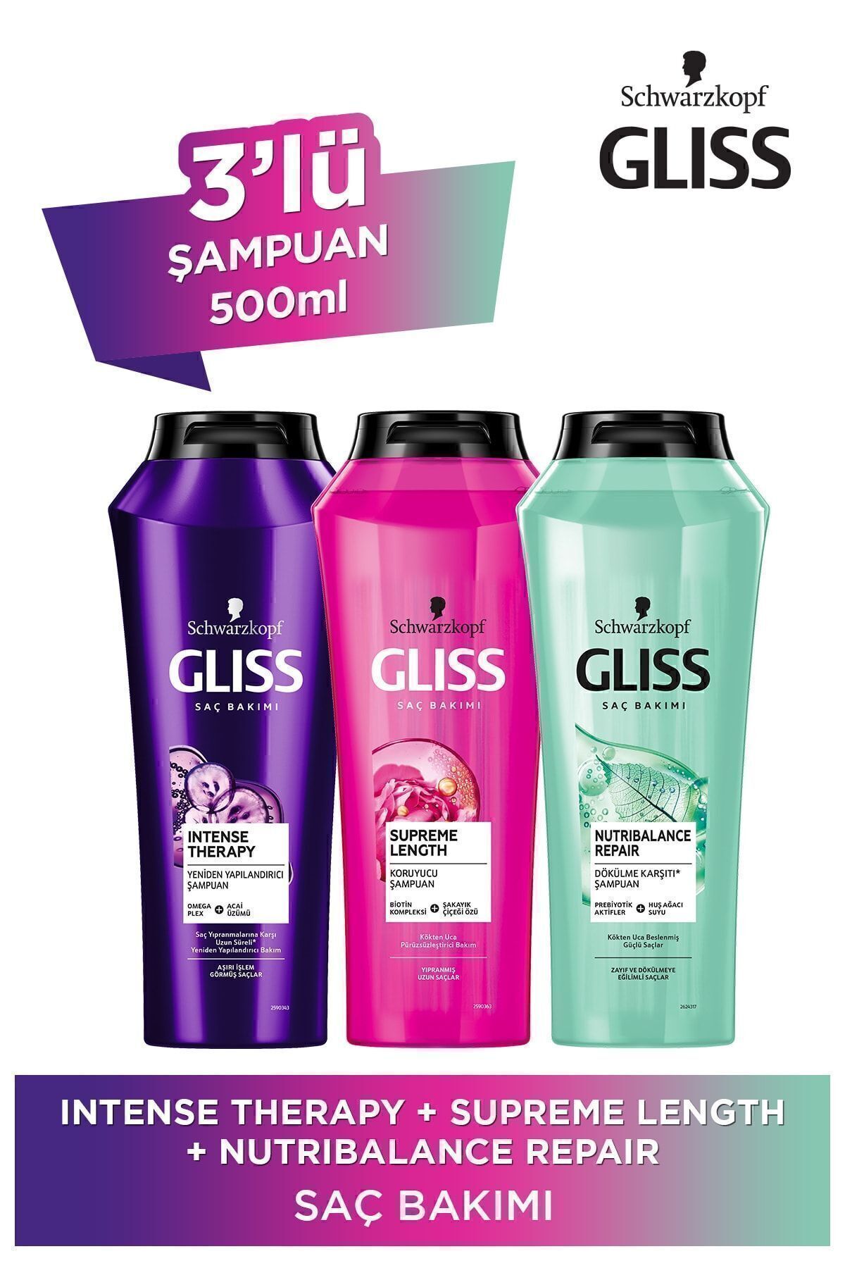 Gliss Intense Therapy Shampoo 500 Ml + Supreme Lenght 500 Ml Shampoo + Nutribalance Repair 500 Ml