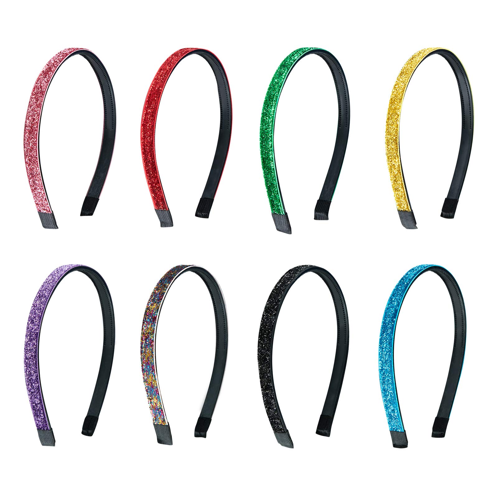 Multicolor Glitter Headband --Velvet glitter fabric hair band with teeth inside ideal for prevent the hairband from slipping when you putting it on your head. --One size fits all toddlers, teenage girls,hold your hair back with these classic elegant and stylish glitter headbands. --Colorful designed fantastic hair accessories great for girls, women. Perfect Christmas present / birthday present. --You can make your hairbands own style, enough for sharing and DIY with your friends and family. --Hair accessory for any events, party favor, festival, beach, travel etc. Also useful for washing face, makeup. Specification: Material: plastic and fabric Hair band width: about 1cm/0.4inch Hair band height: about 13.5cm/5.3inch Colors: as the picture shows Package Includes: 8 x Glitter Headbands Warm Tips : 1) Due to the light and screen setting difference, the item's color may be slightly different from the pictures. 2) Please allow slight dimension difference due to different manual measurement. Your satisfaction is our greatest pursuit, please feel free to contact with us if you have any question. We will reply you in a working dayMulti-Usages: Suitable for girls and women to wear in different occasions like parties, wedding, concerts, Halloween, etc. Can also be used as birthday or bridal gift for your family, friends or lovers. Simple Design: Simple solid color design, very classic and fashion, you can wear the headband itself, or you can decorate these headbands with your favorite accessories like bow, flower and clips, to become beautiful hair decorations. Size: Satin covered headband is about 0.4 inch/1cm in width. Very flexible, easy attachment to hair, and not slip easily as well as not hurt your scalp, suitable for girls or women of all ages. Multi-colors: This set of glitter hairbands with 8 different colors, you can choose different colors of hairband according to your different clothes style. Multiple colors, many choice, let you have a different makeup every day. Material: The colored headbands are made of glitter velvet and elastic plastic, the satin are soft and skin-friendly. The hairbands durable and with good elasticity, won't break easily, appropriate bending give you a comfortable feeling.