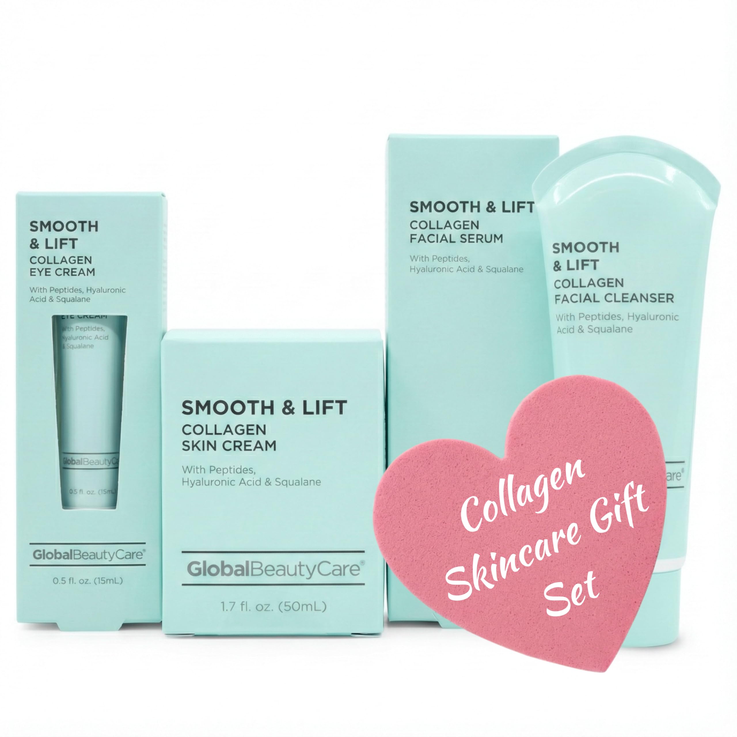 This Collagen Smooth Lift Skincare Set is a complete 4-piece facial care routine designed for women seeking smoother-looking skin, improved firmness, and lasting hydration. Suitable for dry, normal, combination, and sensitive skin types, this skin care set includes a gentle facial cleanser, a treatment serum, eye creams, and a face cream that work together to cleanse, treat, hydrate, and moisturize the face and delicate eye area. Key ingredients include collagen, peptides, hyaluronic acid, and squalane, which help visibly smooth skin texture, improve moisture levels, support a plumper appearance, and reduce the look of fine lines. To use, cleanse first, apply the serum to the face, gently pat eye cream around the eye area, and finish with the face cream use morning and night as part of a simple daily skin care routine. Lightweight, fast-absorbing formulas layer easily without greasy residue, making this routine comfortable for everyday use at home or while traveling. With consistent use, skin may feel more hydrated and smoother within days, while visible improvements in firmness and fine lines typically appear over several weeks. This coordinated skincare bundle is ideal for daily self-care or gifting, offering an easy, effective approach to maintaining healthy-looking, refreshed, and youthful skin.IDEAL SKINCARE GIFT SET FOR WOMEN: A thoughtfully curated women's skincare gift set that combines essential products into one convenient skin care bundle. Perfect as a beauty gift set, face care gift set, or self-care essential, this skin care set makes a versatile option for birthdays, holidays, or everyday pampering while supporting a complete and effective skin care routine. LIGHTWEIGHT, EASY-LAYERING FORMULAS: Fast-absorbing, non-greasy textures layer smoothly without heavy residue, making this skin care routine kit suitable for both morning and night use. Designed for everyday wear, this skincare set works well as a travel-friendly skin care travel set allowing you to maintain your face care routine at home or on the go. HYDRATING FIRMING SKIN SUPPORT: Formulated with collagen, peptides, hyaluronic acid, and squalane, this anti-aging skincare set helps visibly smooth skin texture, improve moisture levels, and support a more supple and plump appearance. Ideal for dry or sensitive skin, this skin care set for women delivers balanced hydration and comfort while helping reduce the appearance of fine lines for healthier-looking skin. COMPLETE FACIAL CARE ROUTINE: An all-in-one facial skin care set for women that cleanses, treats, hydrates, and moisturizes both the face and eye area. This face care set and facial care kit is ideal for daily use, helping simplify your skin care routine with coordinated formulas that work together as a cohesive skin care set for consistent results and long-term skin comfort. COLLAGEN SMOOTH LIFT SKINCARE SET: This complete skin care set for women includes a facial cleanser, treatment serum, eye creams, and face cream designed to support smoother-looking skin, visible firmness, and a lifted appearance. Created as a simple daily skin care routine kit, this skincare kit helps streamline face care while delivering collagen-focused support for hydrated, refreshed, and more youthful-looking skin.