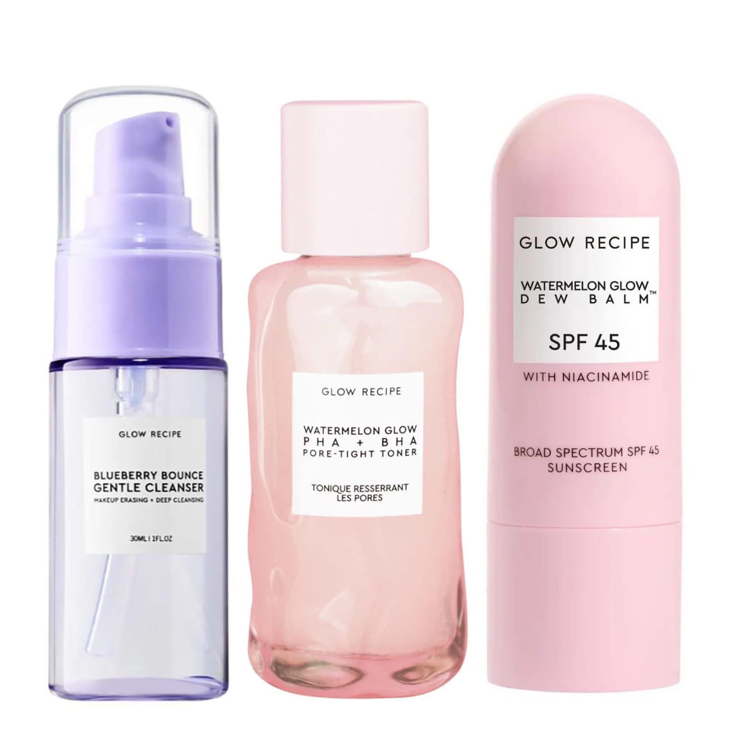 Discover the secret to glowing, healthy skin with Glow Recipe's Morning Cleanse Kit. This all-in-one skincare bundle features three powerhouse products that harmoniously cleanse, tone, and hydrate your skin, leaving it refreshed and radiant throughout the day. The blueberry face cleanser is an antioxidant-rich wash that gently removes impurities and makeup while hydrating your skin. This must-have set also includes the Watermelon Pore-Tight Toner for effortless hydration, and Watermelon SPF Dew Balm for sun protection and a radiant glow.Formulated Differently - We strive in creating a sensorial, enjoyable self-care experience, taking it day by day, skin by skin. Made without Parabens, Mineral Oil, Sulfates, Pthalates, Dry Alcohols and Synthetic Dyes. Our skincare sets, amongst all other products, are Vegan Cruelty-Free. Watermelon Glow Dew Balm SPF - Protect, hydrate, instantly glow with our best selling glow serum now in an SPF stick! This hydrating face sunscreen contains broad spectrum SPF 45 and is rated PA , to shield against UVA UVB rays while helping to even tone prevent dark spots. The translucent, balmy, non-comedogenic formula leaves skin with a dewy glow, never greasy! Perfect for everyday protection on-the-go reapplication. Pore-Tight Toner Mini - Hydrate skin and tighten pores at once with the ultra-gentle Toner. Contains a balance of hydrating ingredients and pore-tightening actives to equally minimize the look of pores and hydrate skin, with gentle yet effective actives such as PHA and BHA. Travel Size Blueberry Gentle Cleanser - This effective yet gentle 3-in-1 bouncy makeup eraser, cleanser, and deep clarifying mask hydrates the skin without stripping it, helping to combat blemishes and breakouts over time. Instant Morning Glow - Unlock your most radiant skin with Glow Recipe's Morning Cleanse Kit, a curated trio of skincare essentials designed to cleanse, tone, and hydrate. This kit is your key to a refreshed and glowing complexion, perfect for starting your day on a bright note.