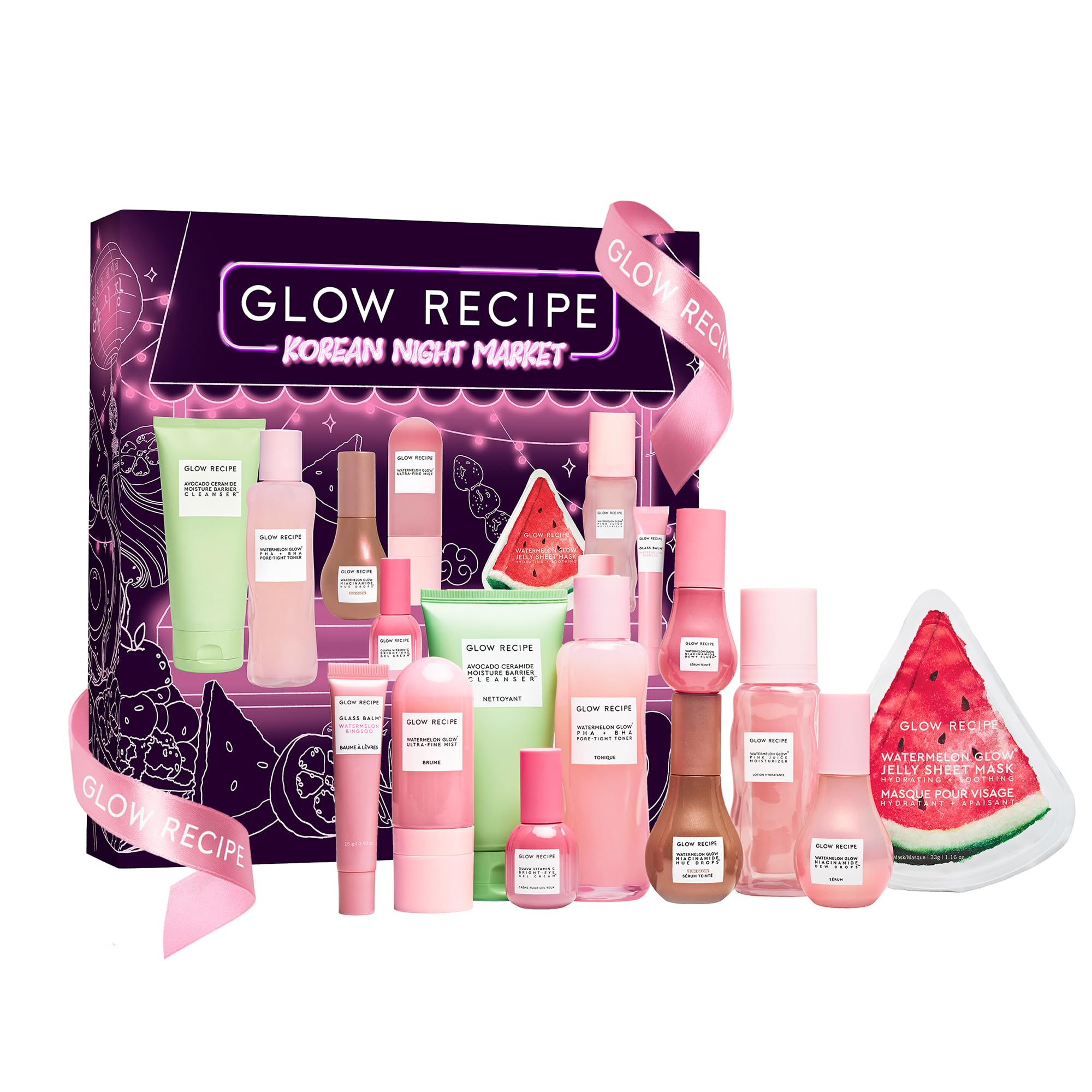 Step into Seoul's night market magic with the Glow Recipe Holiday 2025 Vault, a limited-edition collection of 10 full-size favorites designed to drench skin in hydration, brighten with fruit-powered actives, and finish with juicy pops of color. Curated as the ultimate holiday gift, this festive vault delivers the complete Glow Recipe experience in one set. Start with nourishing cleansers, refreshing mists, and pore-refining toners that prep skin with sensorial textures. Layer in hydration and radiance with icons like Niacinamide Dew Drops, Sun Glow Hue Drops, Pink Juice Moisturizer, and Guava Vitamin C Eye Cream to visibly brighten, plump, and smooth. When it's time for festive finishing touches, reach for the Dewy Flush cheek serum, the cooling Watermelon Glow Sheet Mask, and glossy Glass Balm Lip Treatment to leave skin soft, radiant, and celebration-ready. Each formula is vegan, cruelty-free, and crafted with clean ingredients powered by antioxidant-rich fruit. Packaged in a bold, holiday-exclusive vault, this collector's set is the ultimate gift for skincare beginners, beauty enthusiasts, or any glow-getter ready to experience the full Glow Recipe routine.Fruit-Powered Korean Skincare - Glow Recipe creates clean, clinically effective skincare rooted in K-beauty. Innovative, sensorial formulas pair antioxidant-rich fruit with gentle actives for real results. Vegan. Cruelty-free. Festive Finishing Touches - Juicy cheek tints, glossy lip balm, and a cooling watermelon sheet mask complete the look, leaving skin dewy, smooth, and celebration-ready. Hydration Meets Radiance - From cult-favorite Dew Drops to Sun Glow Hue Drops and Pink Juice Moisturizer, this set layers hydration, brightening, and plumping benefits for bouncy, luminous skin. Your Glow Routine, Start to Finish - Gentle cleansers, hydrating mists, and pore-refining toners prep skin with sensorial textures and fruit-powered actives that make every step feel like self-care. The Ultimate Holiday Glow Gift - 10 full-size favorites come together in this exclusive vault to drench skin in hydration, boost radiance, and deliver juicy pops of color. A complete Glow Recipe routine in one festive set.