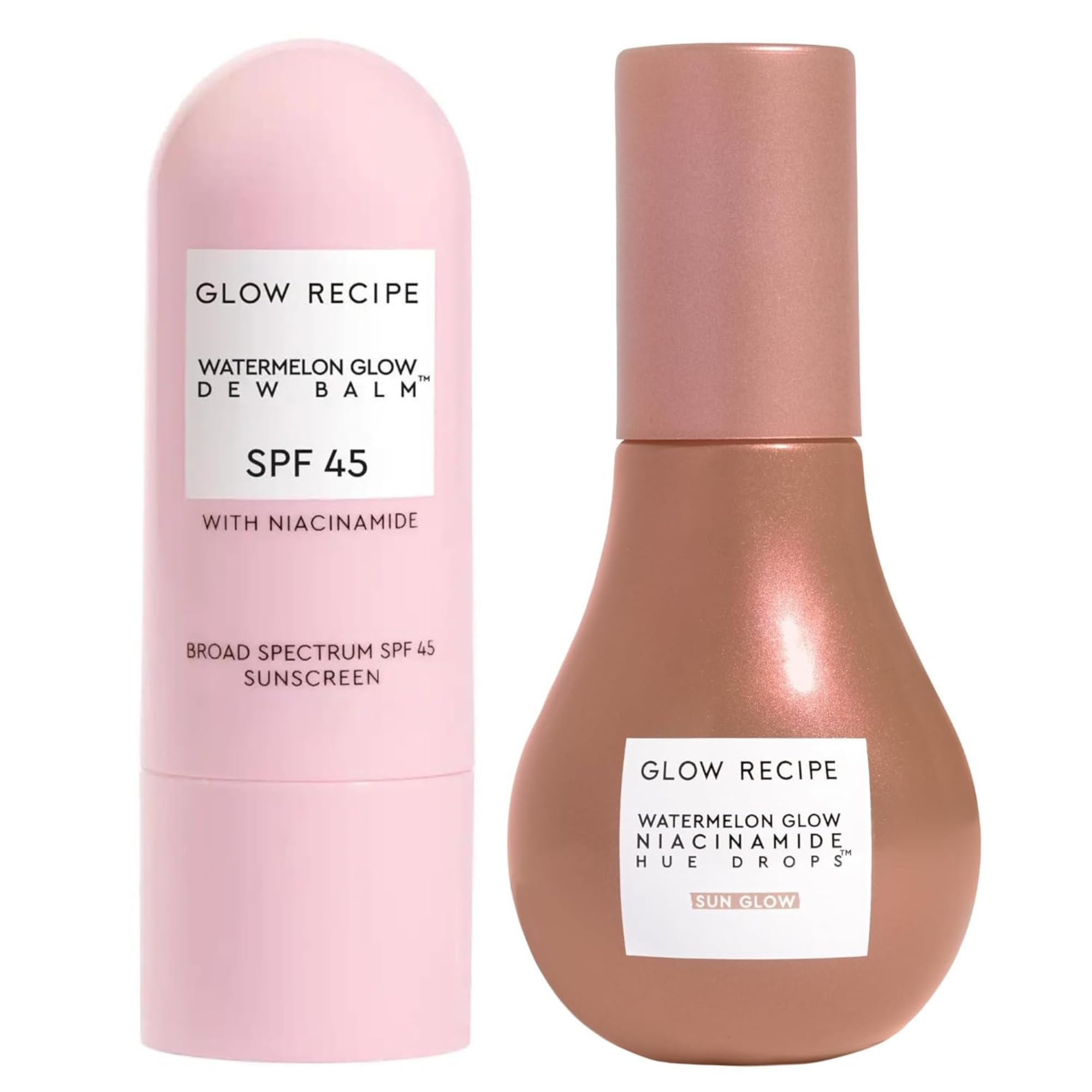 These clinically effective summer essentials leave you with an instant warm glow while evening skin tone over time with Hue Drops, while Dew Balm SPF 45 protects skin from UVA UVB rays while leaving a hydrated, dewy glow. Our Watermelon Hue Drops feature the clinically effective brightening hydrating ingredients of our best selling Dew Drops, now with a warm hue. Our Dew Balm contains broad spectrum SPF 45 and is rated PA , to shield against UVA UVB rays while helping to even tone prevent hyperpigmentation.Formulated Differently - We strive in creating a sensorial, enjoyable self-care experience, taking it day by day, skin by skin. Made without Parabens, Mineral Oil, Sulfates, Pthalates, Dry Alcohols and Synthetic Dyes. Our skincare sets, amongst all other products, are Vegan Cruelty-Free. How to use - For the Hue Drops, as the last step of your daytime skincare routine, blend 1-2 pumps onto the face neck with fingertips. For the Dew Balm, warm the stick on the back of your hand and apply generously to your face in 4 passes per area, ensuring full coverage. Reapply every 2 hours, especially after swimming or sweating. Bronzing Hue Drops - Niacinamide is a leading ingredient in this bronzing serum, helping to visibly minimize the look of pores over time for skin that looks and feels healthy, rather than makeup-y. Hyaluronic acid and watermelon hydrate and soothe your complexion, while delivering essential vitamins to your skin. Centella Asiatica helps to soften and calm skin, decreg the appearance of redness. Watermelon Glow Dew Balm SPF - Protect, hydrate, instantly glow with our best selling glow serum now in an SPF stick! This hydrating face sunscreen contains broad spectrum SPF 45 and is rated PA , to shield against UVA UVB rays while helping to even tone prevent dark spots. The translucent, balmy, non-comedogenic formula leaves skin with a dewy glow, never greasy! Perfect for everyday protection on-the-go reapplication. Must-have Summer Essentials - These clinically effective summer essentials leave you with an instant warm glow. Our Watermelon Hue Drops Dew Balm are the ultimate two-step routine for summer complete with a warm glow dewy sun protection.
