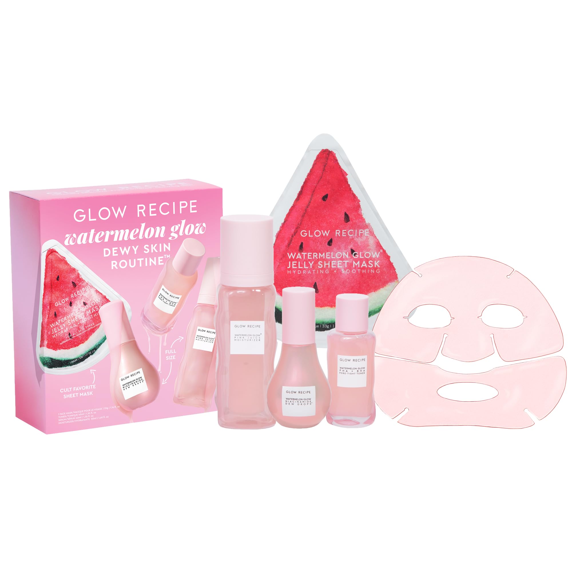 Celebrate the season of glow with the Glow Recipe Watermelon Glow Dewy Skin Routine Kit, a festive four-piece set that makes skincare feel like self-care. This limited-edition collection features Glow Recipe's most iconic formulas to hydrate, brighten, and smooth for radiant, glassy skin. Start with the Watermelon Jelly Sheet Mask, soaked in a full bottle of cooling serum and infused with cold-pressed watermelon extract to instantly refresh, soothe, and deeply hydrate. Next, refine and plump with the travel-size PHA BHA Pore-Tight Toner, a gentle exfoliating formula that smooths skin, minimizes the look of pores, and restores hydration. Follow with Watermelon Glow Niacinamide Dew Drops, the award-winning serum-meets-primer hybrid powered by niacinamide, watermelon extract, and hyaluronic acid to brighten, hydrate, and create a luminous glow. Complete the routine with Pink Juice Oil-Free Moisturizer, a lightweight gel-cream that locks in hydration and leaves skin bouncy, dewy, and refreshed. Vegan, cruelty-free, and crafted with fruit-powered ingredients, this holiday-exclusive kit is the perfect gift for beauty lovers - or a festive treat for yourself.Fruit-Powered Korean Skincare - Glow Recipe creates clean, clinically effective skincare rooted in K-beauty. Innovative, sensorial formulas pair antioxidant-rich fruit with gentle actives for real results. Vegan. Cruelty-free. Bright, Bouncy Finish - Layer Watermelon Glow Dew Drops for instant radiance and even tone, then seal with Pink Juice Moisturizer for lightweight, oil-free hydration. Together, they reveal a fresh, glassy, radiant complexion. Pore Refining Skin Smoothing - The Watermelon Glow PHA BHA Pore-Tight Toner combines gentle exfoliation and pore care with hydration. PHA smooths while BHAs and tea tree decongest, leaving skin clarified, plump, and visibly refined. Instant Burst of Hydration - Start with the Watermelon Glow Jelly Sheet Mask, a two-piece hydrogel mask soaked in cooling serum. Infused with cold-pressed watermelon extract, it hydrates, soothes, and refreshes for bouncier, radiant skin. The Perfect Glow Gift - Curated for skincare lovers and glow-getters, this limited-edition set transforms everyday routines into a self-care moment. A festive way to discover Glow Recipe's most loved products.