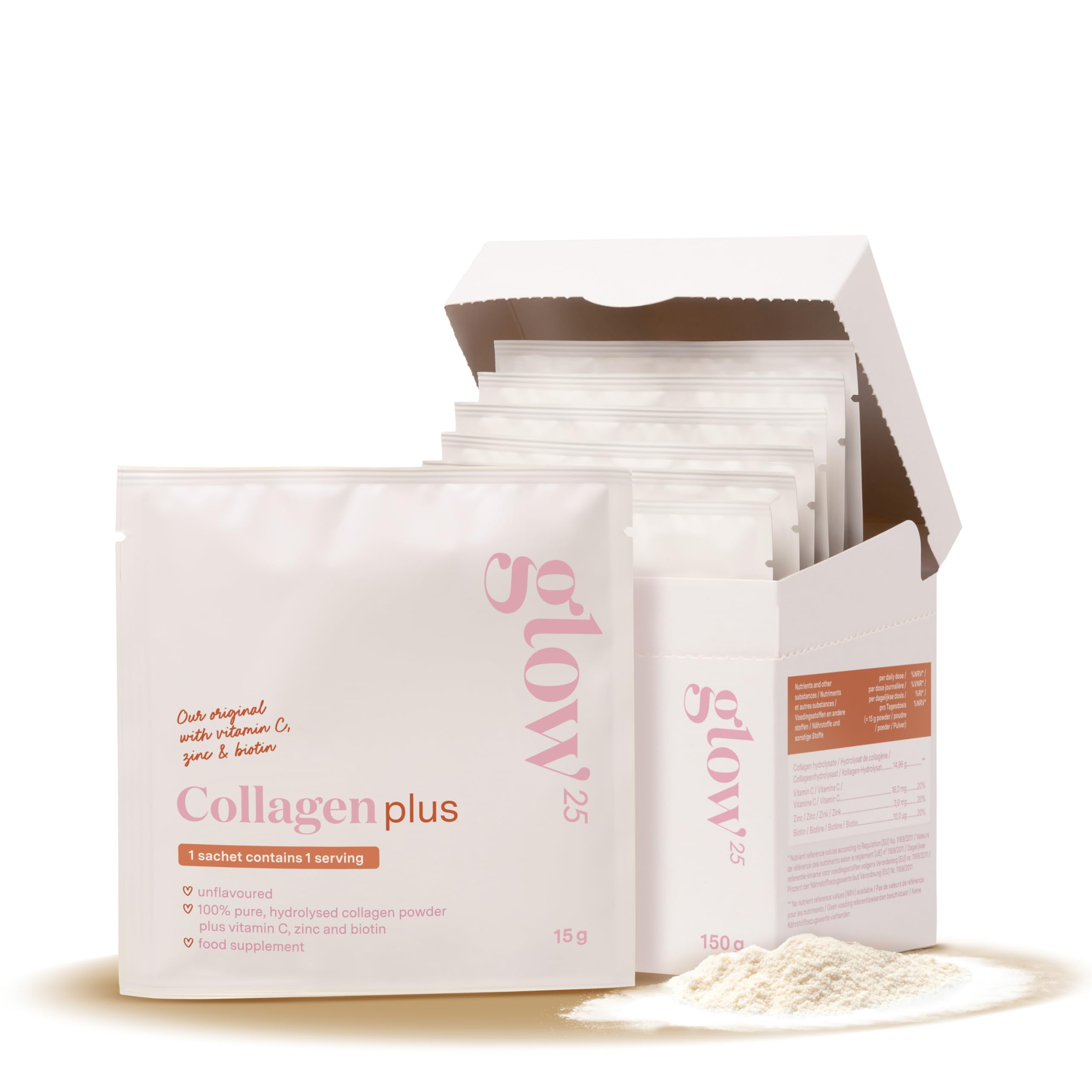 The Glow25 promise: Your satisfaction is our demand! If you are not satisfied with our collagen hydroyzate, you will receive your money back immediately within the first 60 days. Good quality: Glow is easy to mix with cold or hot drinks, making it a perfect fit for your daily routine. Thousands of other women have gone before you: thousands of women choose Glow25 every day as part of their personal care routine. Pure and reliable: Glow25 is pure and honest So we don't use any flavourings, colorings or sweeteners. Just pure collagen, as it should be. Special processing: thanks to our special processing, the collagen is super fine. Thanks to our special way of processing, the collagen is super fine. So nice for your body! Easy and versatile: Whether you're drinking your morning coffee or enjoying a smoothie, Glow25 fits perfectly into your rhythm. It has a neutral taste and dissolves super quickly, whether you use it hot or cold. You don't even notice it's there!Glow25 collageen plus met vitamine C, zink en biotine hoogwaardig collageenhydrolysaat peptiden type 1 en 3 lost goed op (150g) 150g (10 sachets)De Glow25 belofte: Jouw tevredenheid is onze eis! Als je niet tevreden bent met ons collageen hydroysaat, ontvang je direct je geld terug binnen de eerste 60 dagen. Van goede kwaliteit: Glow is eenvoudig te mengen met koude of warme dranken, waardoor het perfect past bij jouw dagelijkse routine. Duizenden andere vrouwen gingen je al voor: duizenden vrouwen kiezen dagelijks voor Glow25 als onderdeel van hun persoonlijke verzorgingsroutine. Puur en betrouwbaar: Glow25 is puur en eerlijk bij ons dus geen smaakstoffen, kleurstoffen of zoetstoffen. Gewoon puur collageen, zoals het hoort. Speciale verwerking: dankzij onze speciale verwerking is het collageen superfijn. Dankzij onze speciale manier van verwerken is het collageen superfijn. Wel zo fijn voor je lichaam!. Makkelijk en veelzijdig: Of je nu je ochtendkoffie drinkt of geniet van een smoothie, Glow25 past perfect in jouw ritme. Het heeft een neutrale smaak en lost supersnel op, of je het nu warm of koud gebruikt. Je merkt niet eens dat het er in zit!.