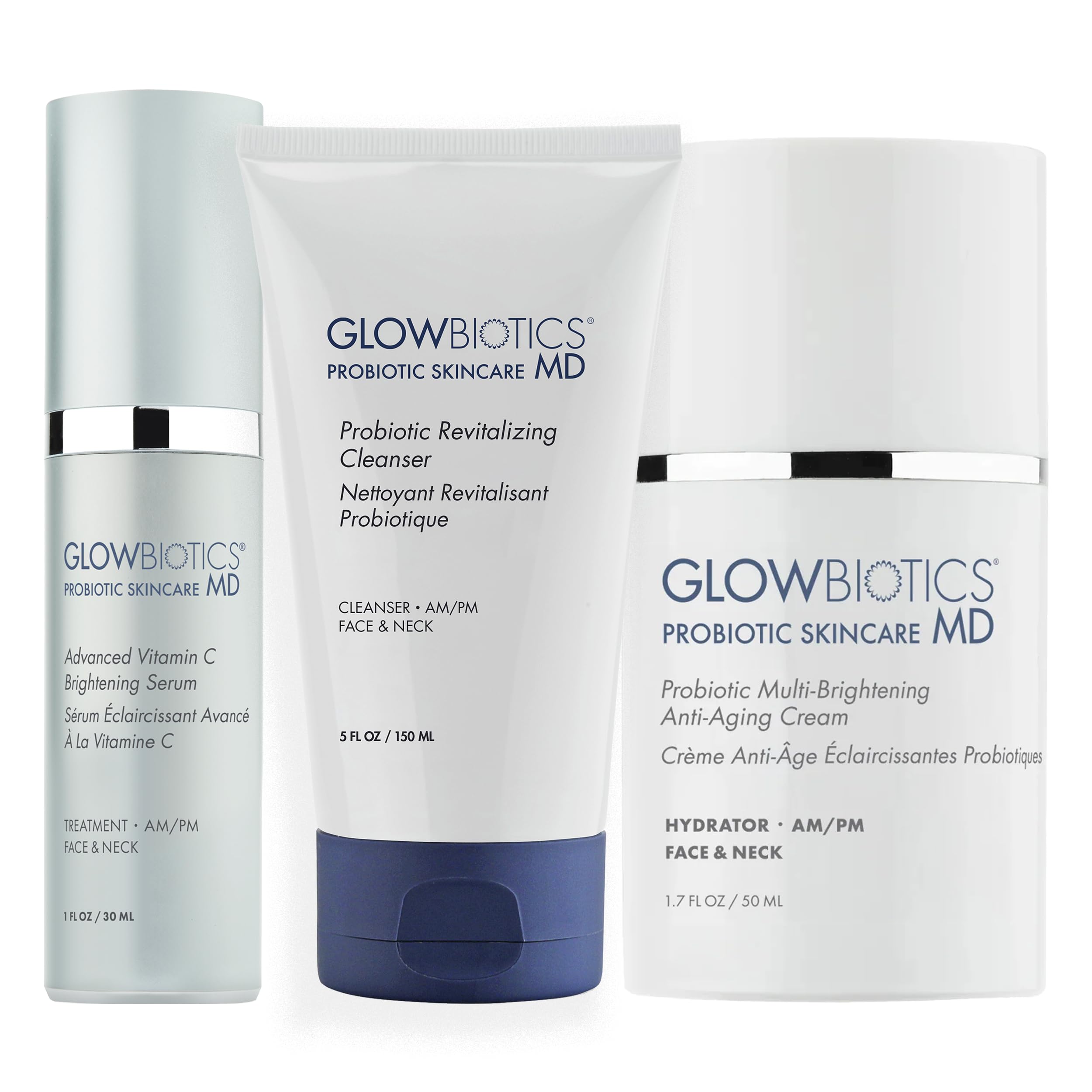 Reveal radiant, luminous skin with the Glowbiotics Complete Brightening System. This 3-step routine is designed to enhance your natural glow and promote a more even-looking complexion. This comprehensive set combines our Probiotic Revitalizing Cleanser (5 oz), Advanced Vitamin C Brightening Serum, and Probiotic Multi-Brightening Cream for a complete brightening regimen from cleanse to treatment to moisturizer. Formulated with dual complex vitamin C, probiotic technology, Smart Peptide 189, hyaluronic acid, niacinamide, green tea antioxidants, Actiwhite, shea butter, and essential fatty acids. This system works together to hydrate and refresh while addressing the appearance of uneven tone and dullness. The Advanced Vitamin C Serum comes in an airless pump bottle to prevent oxidation and sustain potency longer. Perfect for dry and normal skin types seeking a more radiant, glowing complexion.GENTLE YET EFFECTIVE FOR DRY SKIN: Revitalizing Cleanser won't strip skin, Vitamin C formula is non-irritating and suitable for sensitive skin with bearberry extract and SymCalmin, and Multi-Brightening Cream provides rich moisture with essential fatty acids, making this system ideal for dry, normal, and mature skin types. ULTRA-HYDRATING RADIANCE BOOSTING: Hyaluronic acid in all three products plus shea butter, safflower oil (high in ceramides), and green tea antioxidants (200x more powerful than vitamin E) deliver deep hydration while addressing the appearance of fine lines and uneven tone. SMART PEPTIDE TECHNOLOGY: All three products contain Smart Peptide 189 that works when skin needs it, plus the brightening cream adds caffeine for a skin-tightening effect and the cleanser provides anti-aging peptide benefits during cleansing. PROBIOTIC-INFUSED FORMULAS: Each product features probiotic technology (Lactobacillus ferment lysate) to support skin's natural balance and enhance the performance of brightening ingredients while providing a soothing effect on. COMPLETE 3-STEP BRIGHTENING ROUTINE: Includes hydrating gel cleanser with peptides (5 oz), dual vitamin C serum (Magnesium Ascorbyl Phosphate and Ascorbyl Glucoside) in airless pump, and rich brightening cream with Actiwhite, Chromabright, and Sepiwhite MSH for a comprehensive approach to luminous skin.