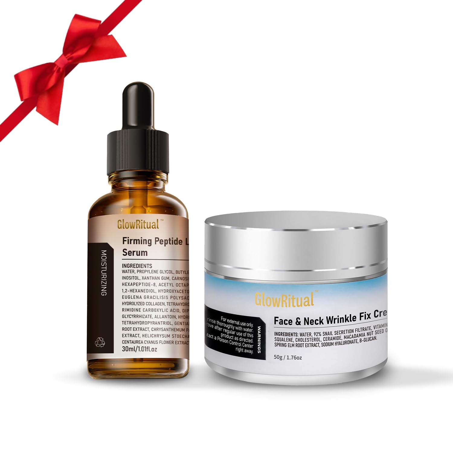 The GlowRitual Anti-Aging Skincare Duo combines our bestselling Peptide Firming Serum with the nourishing Snail Mucin Cream to deliver a complete, synergistic daily regimen. This powerful pair works together to firm skin, smooth wrinkles, provide deep hydration, and boost elasticity for a revitalized complexion—all skin types welcome.Simple Daily Use Trusted Quality For best results, apply the Peptide Serum first, followed by the Snail Mucin Cream, both morning and night on cleansed skin. Made in GMP-certified facilities and rigorously quality-tested, GlowRitual is committed to providing safe, effective, and effortless skincare solutions you can trust every day. Gentle, Layerable For All Skin Types Both formulas are designed to be non-irritating, fast-absorbing, and non-greasy. They layer seamlessly under sunscreen or makeup without pilling. Gentle enough for sensitive skin and effective for dry, oily, and combination skin types, making this duo a versatile addition to any skincare routine. Enhanced Hydration Skin Barrier Support Infused with hydrating Euglena polysaccharide in the serum and deeply moisturizing snail mucin in the cream, this duo helps attract and lock in moisture. This two-step approach aids in maintaining the skin's natural moisture barrier, promoting a dewy, healthy-looking glow and combating dryness throughout the day. Dual-Action Formula: Firming Serum Nourishing Moisturizer The Peptide Serum features a lightweight, multi-peptide and collagen blend designed to help support skin's elasticity and smooth texture. The Snail Mucin Cream provides lasting hydration and nourishment with 92 snail secretion filtrate and Vitamin E, helping to refine skin's appearance and maintain a soft, supple feel on the face and neck. Complete Routine in One Duo This skincare set pairs our best-selling peptide serum with our nourishing snail mucin cream to create a synergistic daily regimen. The serum delivers targeted peptide and collagen support to help improve firmness and the look of fine lines, while the cream locks in moisture with high-concentration snail secretion filtrate to support elasticity and a smooth, plump complexion. Together, they work to improve overall skin texture and hydration.