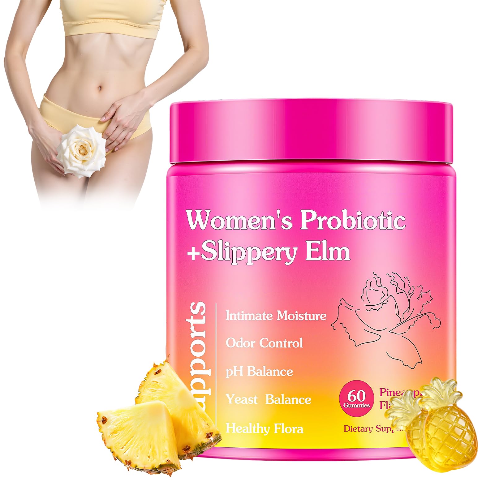 2 Gummies Daily Each bottle contains 60 gummies, with 2 gummies per day providing the perfect monthly supply. Simple and affordable, taking two gummies daily achieves optimal results. Busy women can enjoy delicious taste while effortlessly maintaining gut health and immunity. Refreshing Pineapple-Flavored Gummies Unlike ordinary gummies, our vaginal probiotics gummies are infused with natural Hawaiian pineapple flavor, sugar-free yet still delicious. The portable and easy-to-take design makes daily probiotic supplementation simple and enjoyable, satisfying your taste buds without any health concerns, turning wellness into a sweet daily pleasure. 100 Natural Probiotic Gummies Made with premium probiotics and soothing slippery elm extract, these Women probiotic slippery elm gummies are 100 vegan and gluten-free. Feminine probiotics gummies contain added Bacillus coagulans, which is low in calories and easily absorbed, aiding digestion and nutrient absorption. The natural formula effectively relieves dryness and discomfort, hydrating key areas of the body and enhancing comfort. Enhancing Gut Health and Immunity Our pineapple gummies for women ph balance are rich in probiotics and prebiotics, providing dual care for the digestive system and balancing gut flora. Each pineapple gummy contains essential nutrients to support healthy digestive function while strengthening the body's natural defense mechanisms, offering gentle yet effective support for overall health. Balancing pH Levels and Women's Health Our feminine probiotics gummies are specially designed to support women's health, enriched with a blend of lactobacillus, elm extract, and prebiotics to help maintain a healthy intimate microbiome and pH balance. Enjoying them daily can enhance women's natural defense mechanisms, improve gut health, and provide a refreshing sensation, nurturing women's health from the inside out.