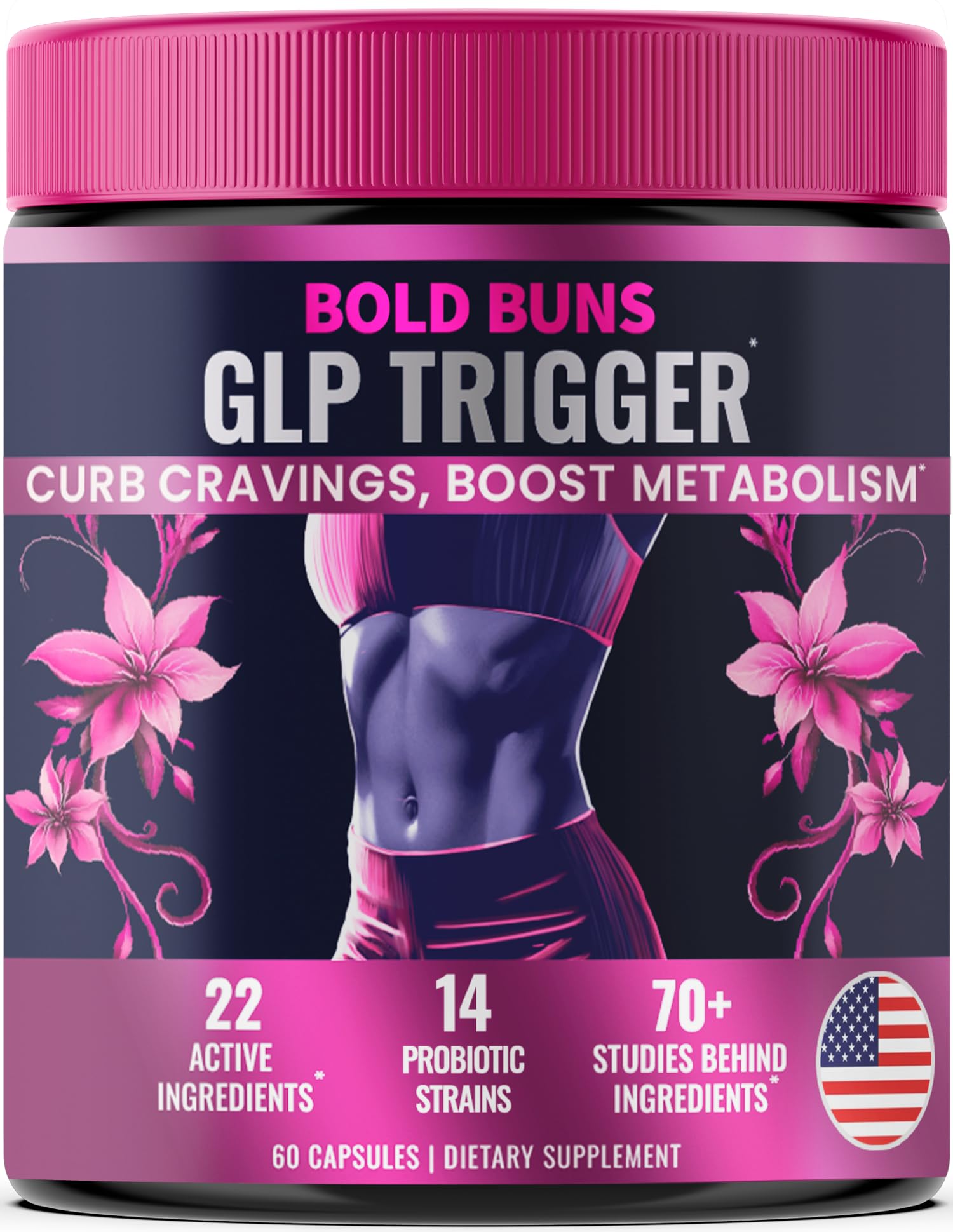 GLP Trigger by Bold Buns is a daily dietary supplement thoughtfully created for women's wellness routines. It includes 22 carefully selected ingredients - featuring plant-based compounds, phytonutrients, and probiotics - to support digestive comfort, metabolic well-being, and everyday balance as part of a healthy lifestyle. At the center of the formula is Supresa, a patented saffron extract studied in healthy adults for its role in supporting positive eating habits and healthy appetite-related behaviors. In a placebo-controlled study, participants taking Supresa reported helpful effects on snacking habits and overall appetite awareness over 8 weeks1. This is paired with additional research-supported ingredients including green tea extract (standardized for EGCG), berberine, turmeric extract (95 curcuminoids), soy isoflavones, and red clover - chosen for their traditional and modern use in supporting metabolic wellness, digestive support, and women's balance. To further complement the formula, each serving includes a 14-strain vegan probiotic blend designed to support a balanced microbiome and gut-brain connection, an area of growing scientific interest related to mood and satiety signaling. Each capsule is vegan and manufactured in the United States in a GMP-certified facility. GLP Trigger contains no synthetic GLP-1, no hormones, and no stimulants. One bottle provides 60 capsules (a 30-day supply) when taken as directed (2 capsules daily with meals). These statements have not been evaluated by the Food and Drug Administration. This product is not intended to diagnose, treat, cure, or prevent any disease.MADE IN USA, VEGAN CLEAN – GMP certified, made in the USA with no synthetic GLP-1 or hormones. Designed for daily use: just 2 capsules per day for steady results. ✓ 22 INGREDIENTS AT EFFECTIVE DOSES – Every capsule is packed with science-backed ingredients at effective doses - full transparency, no fluff formulas or fillers. GUT–BRAIN–HORMONE AXIS SUPPORT – Includes 14-strain probiotic blend to support digestive health, mood balance, and nutrient absorption - a daily ritual for feeling lighter and more energized. SUPPORTS METABOLIC HORMONAL WELLNESS – Combines green tea (EGCG), berberine, turmeric, and phytoestrogens to support fat metabolism, glucose response, and estrogen balance. THE FIRST TO UNITE GLP-1 ESTROGEN SUPPORT – The first formula designed specifically for women that combines GLP-1–supportive ingredients (like Supresa green tea) with estrogen-supportive compounds (like red clover soy isoflavones) for true female metabolic synergy. APPETITE SUPPORT BACKED BY SCIENCE – Features Supresa saffron extract, clinically studied to support reduced hunger by 69 and snacking by 55 in just 8 weeks.