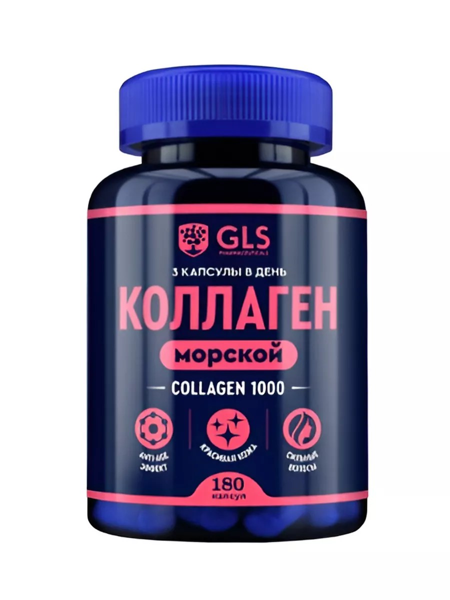 GLS COLLAGEN 1000 - Dietary supplement - Collagen is the main building block of connective tissue and is found in all organs and tissues of the body. Collagen gives tissues firmness and elasticity. With age, collagen production decreases. This leads to decreased skin elasticity, wrinkles, brittle nails, weakened hair, muscle weakness, and fragile bones and joints. Collagen derived from fish is easily absorbed and is the main type of collagen in the body. Hyaluronic acid is a component of the skin, nourishing and moisturizing it. Hyaluronic acid retains water, thereby helping collagen maintain the skin's elastic structure. In addition, it is part of the synovial fluid, which lubricates the joint, protecting it from damage. Vitamin C promotes collagen production and provides antioxidant protection. 3 vegetarian capsules contain: fish collagen hydrolysate - 1050 mg; hyaluronic acid - 45 mg; ascorbic acid - 100.5 mg.