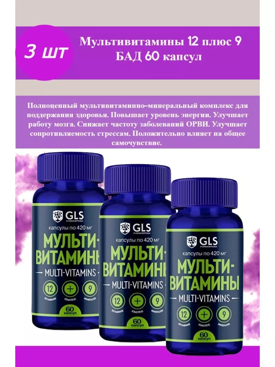 Gls мультивитамины 12+9 - биологически активная добавка (БАД) к пище, которая содержит комплекс важных витаминов и минералов для поддержки здоровья мужчин и женщин. Полноценный витаминно-минеральный комплекс для поддержания здоровья, сбалансирован с учетом суточной потребности в витаминах и минералах.Каждая капсула включает в себя необходимые витамины и микроэлементы, которые способствуют повышению уровня энергии и работоспособности, улучшению общего самочувствия, помогают поддерживать иммунитет, укрепляют нервную систему, улучшают работу мозга, памяти и концентрации внимания, способствуют снижению уровня стресса и нормализации сна, поддержанию здоровья репродуктивной системы. Эти мультивитамины 12+9 рекомендуются для использования в качестве дополнения к рациону, чтобы обеспечить организм всем необходимым для поддержки здоровья. Этот продукт является безопасным и эффективным средством для улучшения общего состояния и борьбы с недостатком витаминов и минералов. Перед применением рекомендуется проконсультироваться с врачом.РЕКОМЕНДАЦИИ ПО ПРИМЕНЕНИЮ: взрослым по 1 капсуле в день во время еды. Продолжительность приема - 1 месяц. При необходимости прием можно повторить.